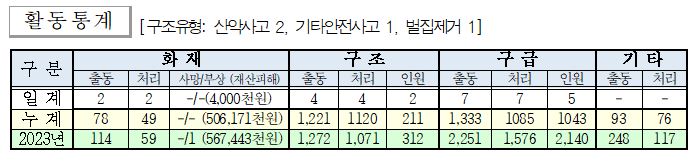 ○ 구조 4건(산악사고 2, 기타안전사고 1, 벌집제거 1)