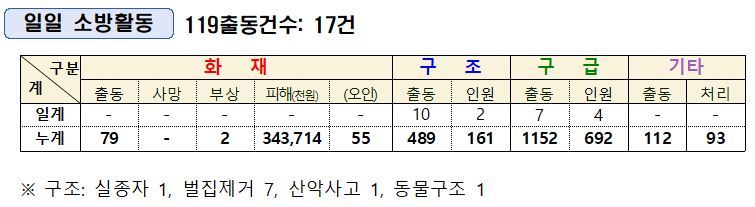 ○ 구조 10건 [실종자 1, 벌집제거 7, 산악사고 1, 동물구조 1]