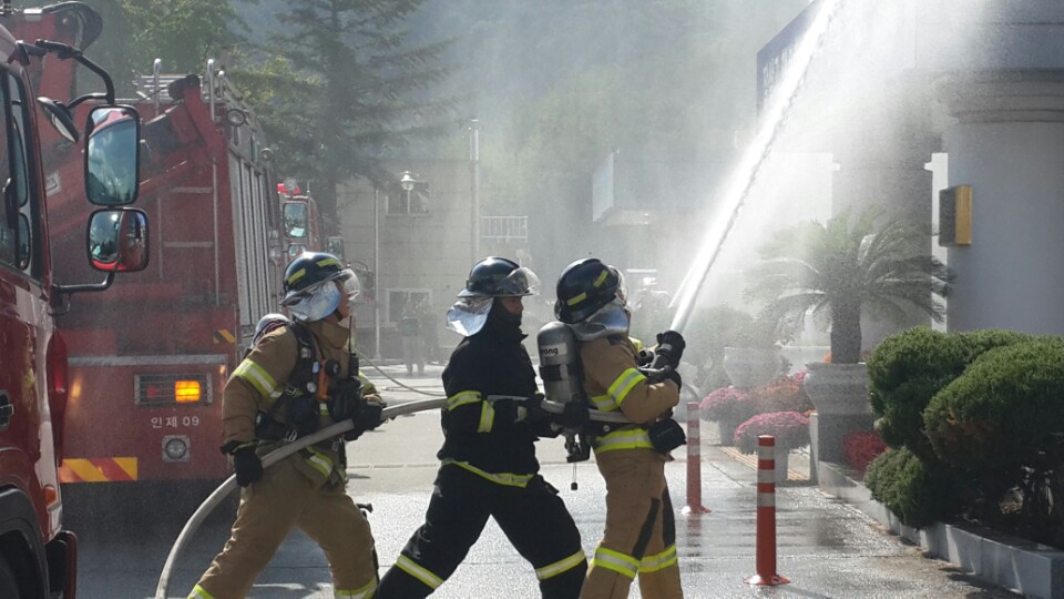 소방 및 군청직원 40여명이 참여한 이번 훈련은 군청 1층 중앙현관 민원실에서 화재가 발생하였음을 가상하여 이루어졌으며, 소방차 도착 전까지 화재발생 전파ㆍ119신고ㆍ인명대피ㆍ소화기 및 옥내소화전 활용한 초기진화 등 인제군청 자위소방대 임무 수행을 확인하고, 신속한 인명구조 및 화재진압을 통한 인적ㆍ물적 피해 최소화에 중점을 두고 실시하였습니다.