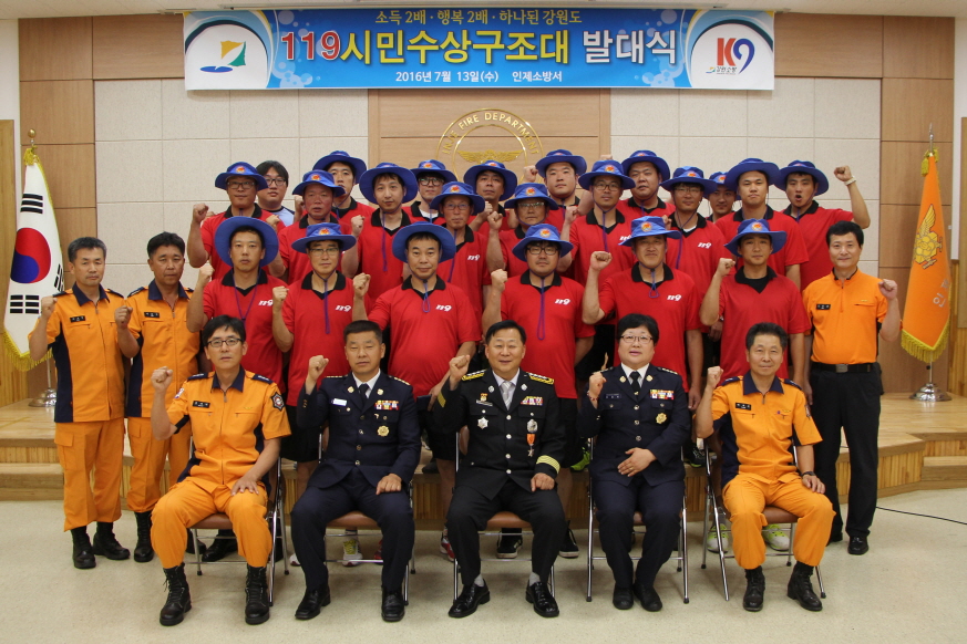 인제소방서 119시민수상구조대는 전현길 대장 외 26명으로 구성되었으며 7월16일부터 8월15일까지 31일간 인제읍 고사리 수변공원에서 하루 4명씩 근무하며 물놀이 장소에서의 유사 시 인명구조 및 위험제거 활동을 벌인다.