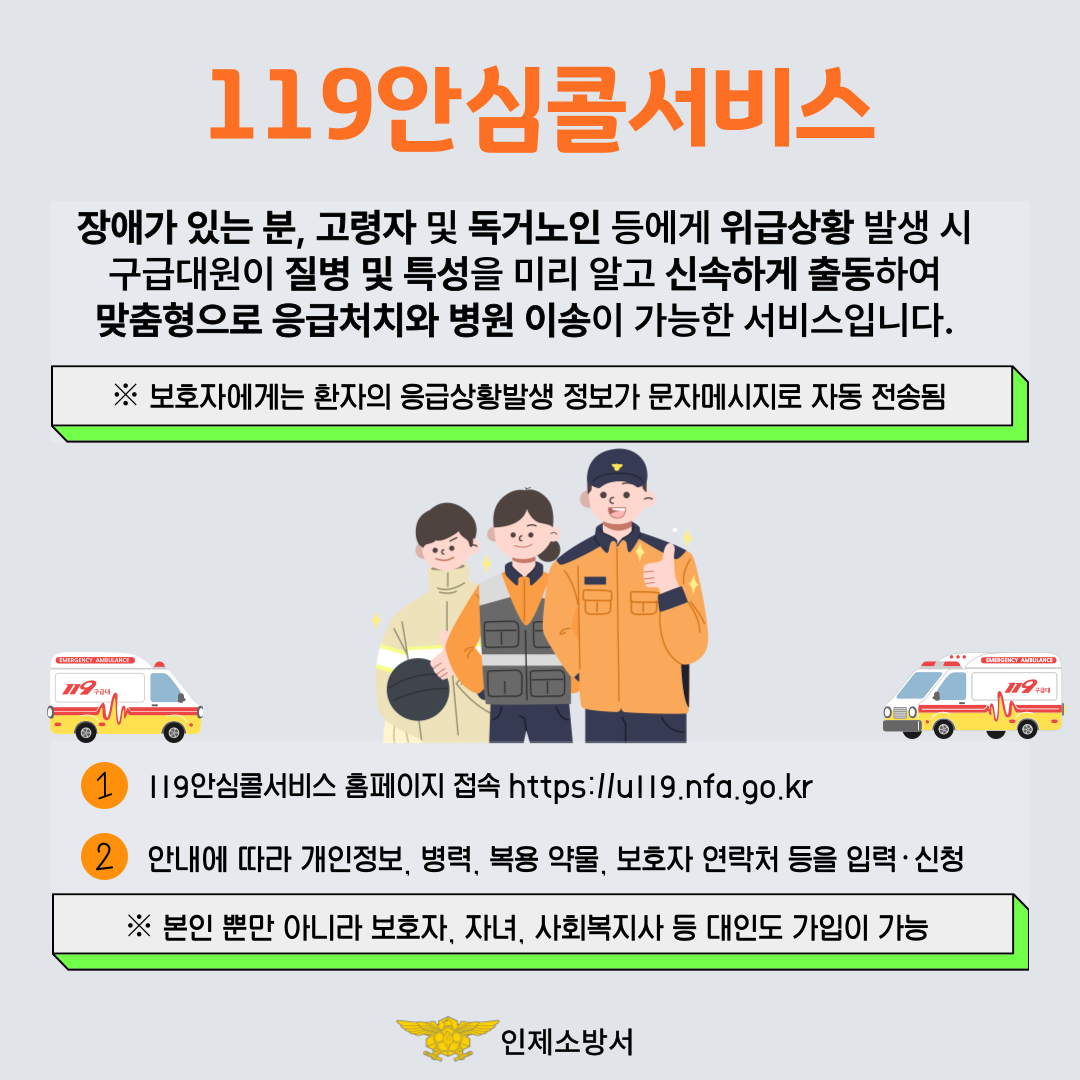 119안심콜 서비스는 장애인이나 고령자, 임산부, 위험군 병력자 등 환자가 위급상황에 처했을 때 소방공무원이 환자의 주소, 질병, 특성 등을 파악한 상태에서 출동할 수 있도록 돕는 서비스입니다.