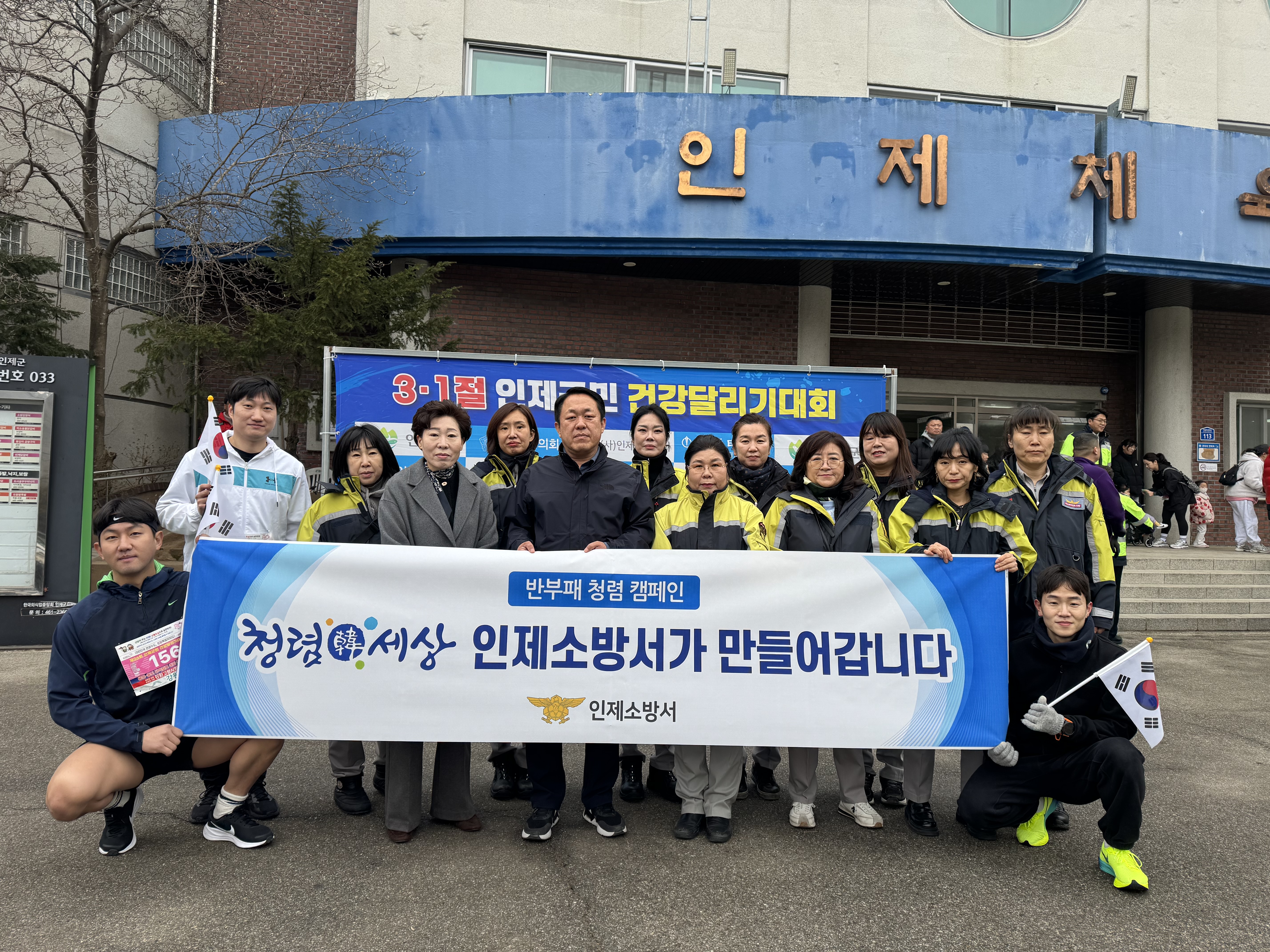 인제소방서는 지난 1일 인제체육관에서 반부패 청렴 캠페인을 진행하고 3.1절 인제군민 건강달리기 대회에 참가하였습니다.