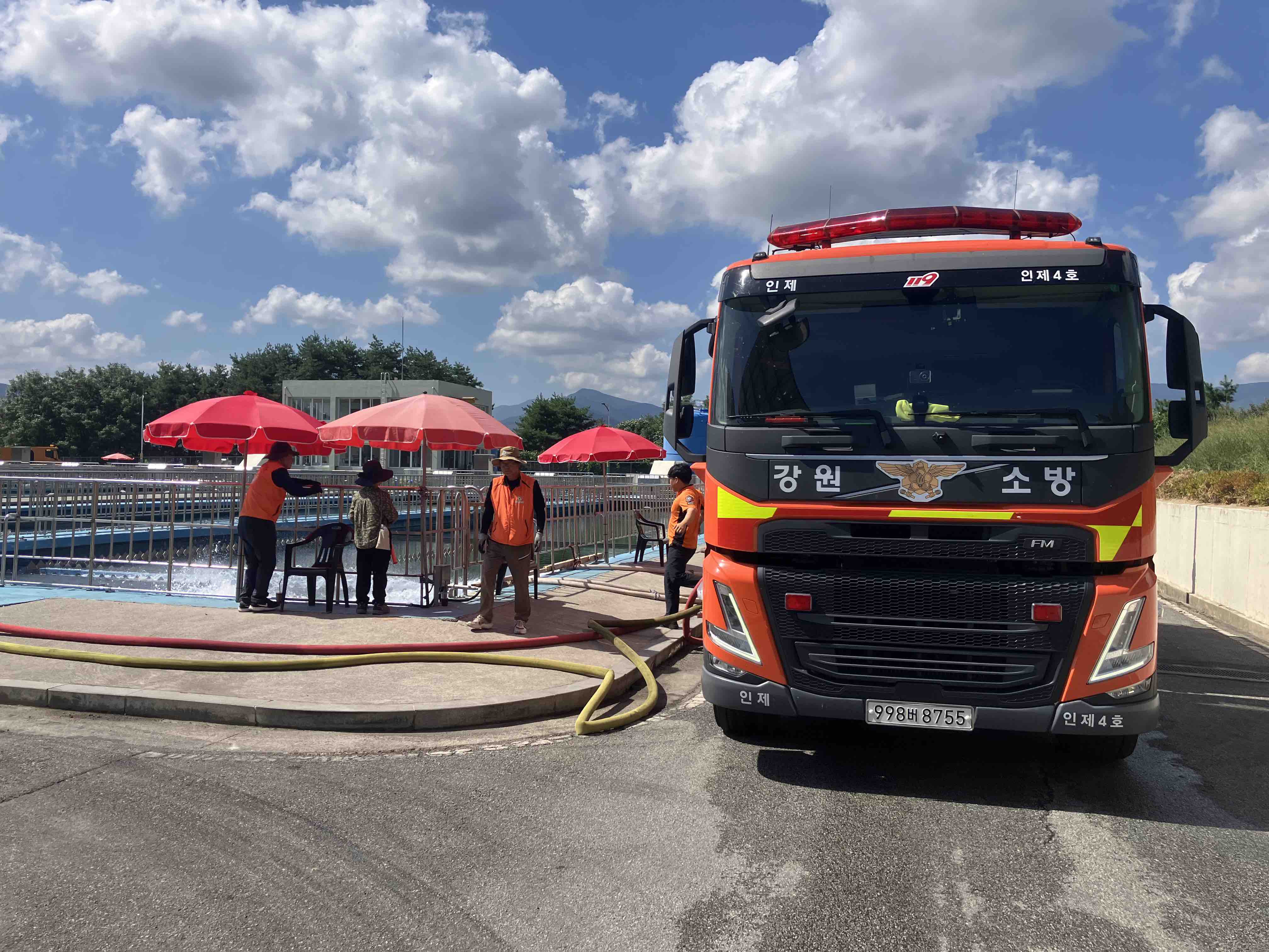 인제소방서는 운용 중인 다기능화학차를 지원차량으로 출동시켜 홍제정수장에 일일 50t 규모의 급수지원을 진행하고 있습니다.