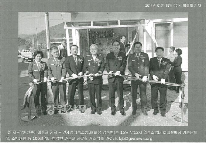 인제읍의용소방대(회장 김중현)는 2014년 1월 15일 낮 12시 의용소방대 회의실에서 기관단체장 소방대원 등 100여명이 참석한 가운데 사무실 개소식을 가졌다.