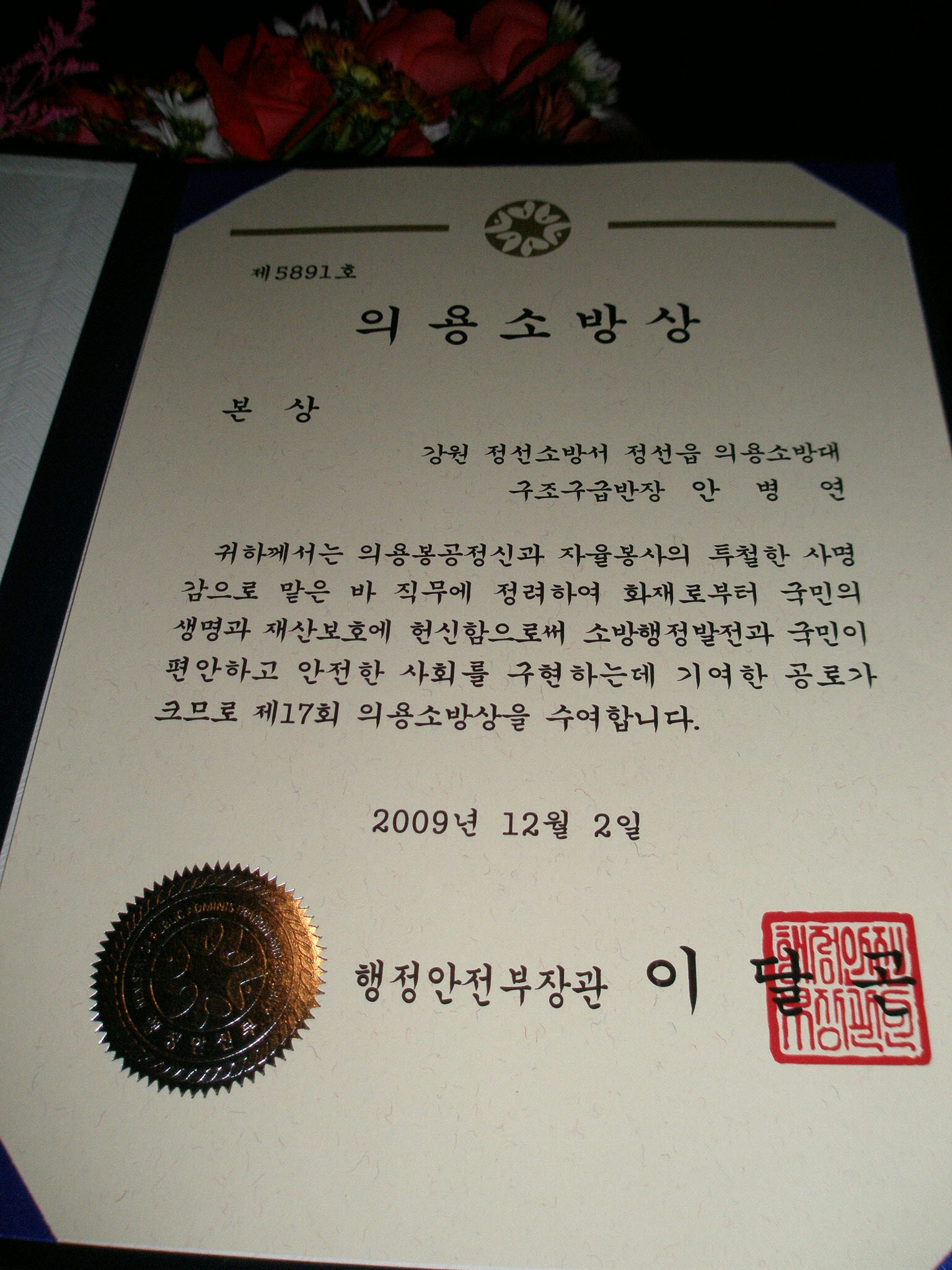 의용소방상장과 표장이 수여되었고 부상으로 상금100만원이