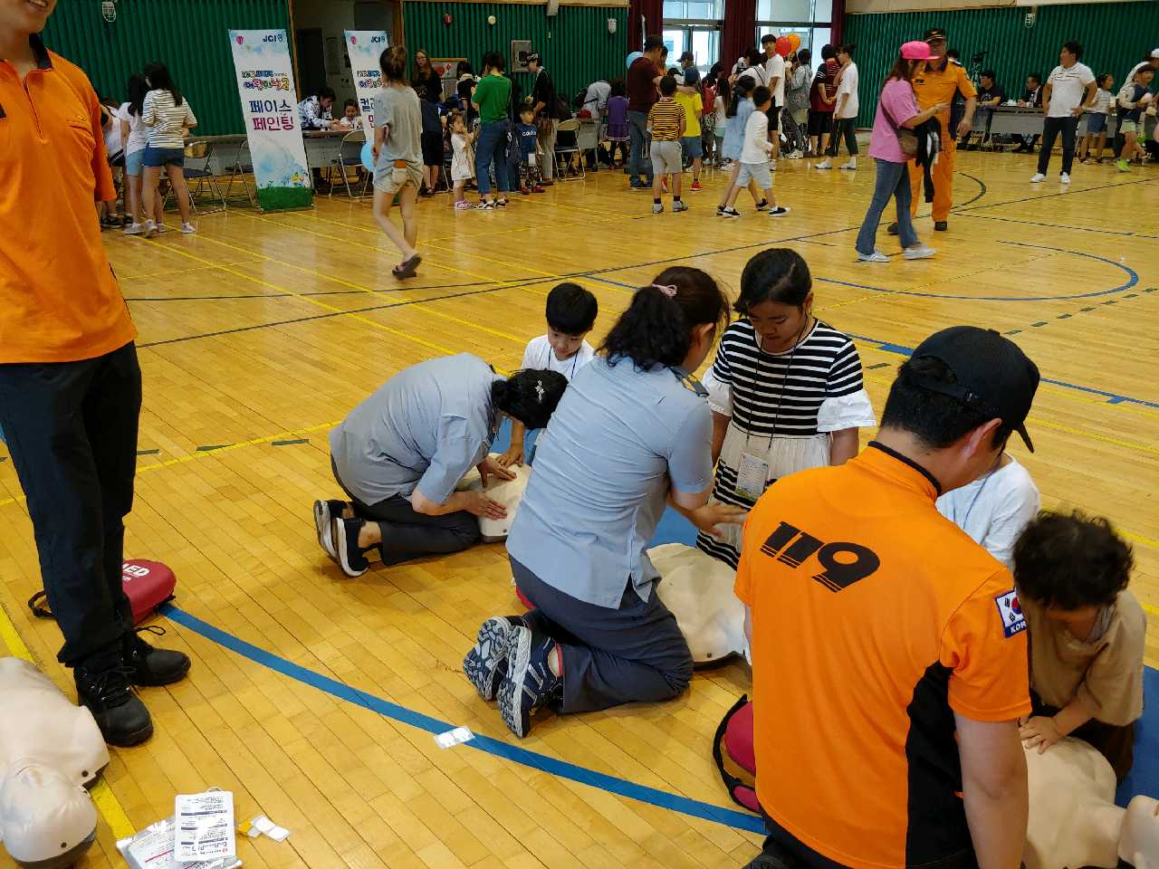 사북여성의용소방대(대장 정옥희)는 2018. 7. 8.(일) 14:00 부터 사북읍 청소년장학센터 3층 실내체육관에서 어린이 범죄예방 뮤지컬 행사에 참여 생활안전, 심폐소생술 교육을 실시하였습니다. 범죄예방 뿐만 아니라 안전교육도 병행하는 알찬 교육현장입니다.