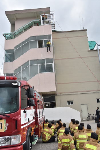 이번 훈련은 ▲ 완강기 이용 비상탈출 ▲ 비상탈출 장비 이용 탈출 ▲ 소방호스 연장(15본) 화재진압 ▲ 고층건물 소방호스 연장 화재진압 등에 중점을 두고 실시됐다.
