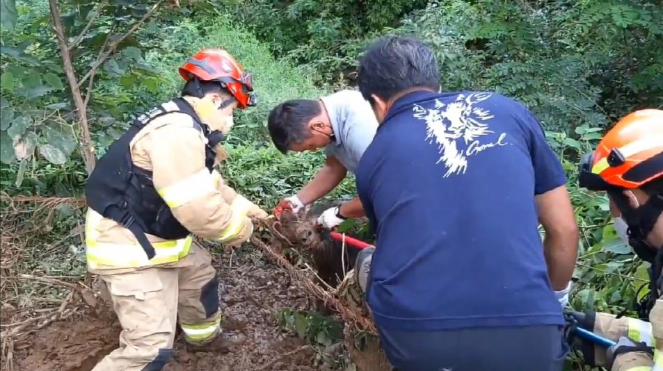 2022-08-03. 정선소방서, ‘여긴 어디 산이양’야생동물 피해 막기 위해 설치한 그물망에 걸린 산양