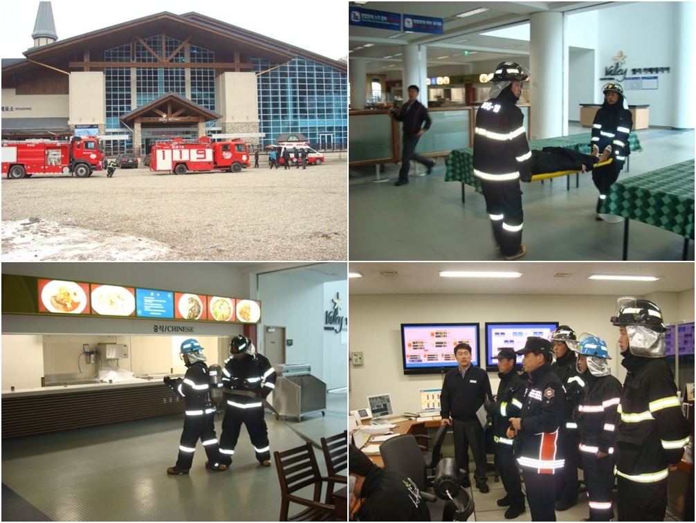 이번 훈련은 하이원스키장 벨리 스키하우스 2층 식당 주방에 가상의 화점을 설정하고 하이원스키장 자위소방대의 초기 대응 및 구조, 구급대의 인명구조, 그리고 화재진압 등의 절차에 의거해 실시했습니다.