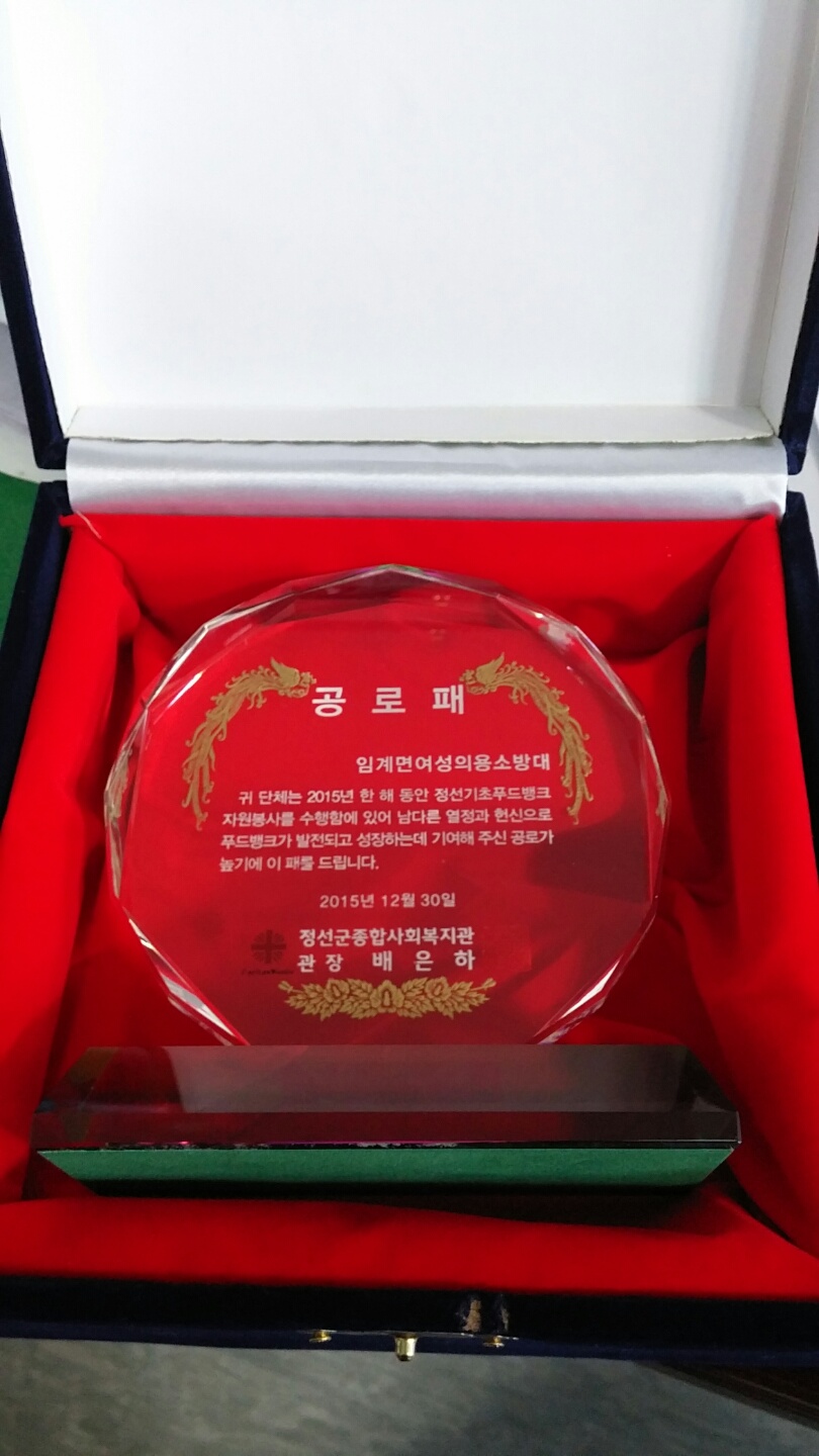 임계여성의용소방대(대장 정옥량)는 12. 22(화) 정선군종합사회복지관(관장 배은하)으로부터 2015년 푸드뱅크 자원봉사유공으로 공로패를 수여받았다.