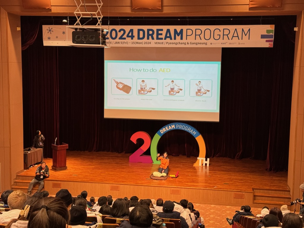 평창소방서는 이번 제20회 드림프로그램 참가자에게 심폐소생술 방법과 자동심장충격기 사용법을 영어자막 자료를 통한 이론 교육 및 CPR마네킨과 교육용 AED를 이용하여 체험형 교육을 실시했다.