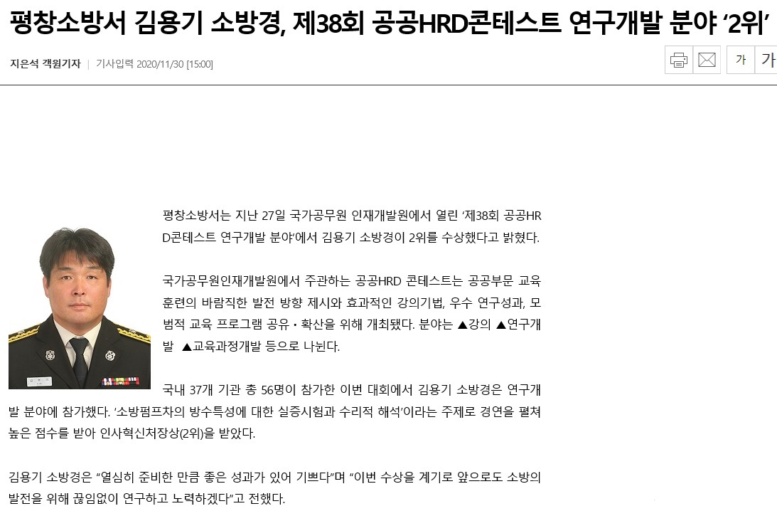 | 886 | 평창소방서 김용기 소방경, 제38회 공공HRD콘테스트 연구개발 분야 ‘2위’ | 평창홍보 | 2020-11-30 | 1025 | |