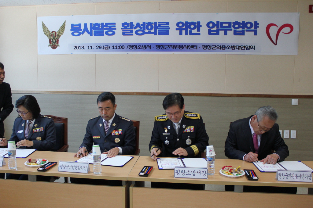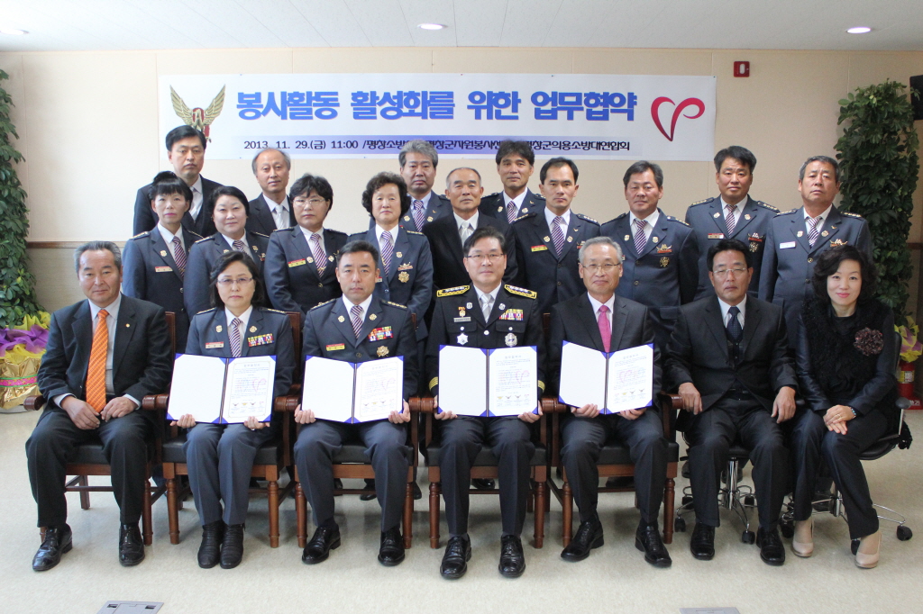 ◇평창소방서(서장 김남숙)는 29일 본서 소회의실에서 평창군자원봉사센터(센터장 김선한)·평창군의용소방대연합회(회장 민경식)간 자원봉사 활성화를 위한 업무협약을 체결 하였다.