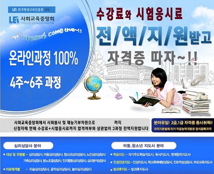 자격기본법에 의거 국무총리산하 한국직업능력개발원에 정식등록 민간자격증취득을 할 수 있는 사회교육중앙회 교육원 에서 개설하고 있는 모든과정에 대해서 사회봉사 및 재능기부의 일환으로 선착순신청자에 한해 무료지원을 해드릴 것이며 4주~6주과정으로 100%온라인과정으로 자격증 취득이 가능하며 본원은 해당분야에서 유일하게 2급자격증과 1급자격증이 동시에 취득됩니다.