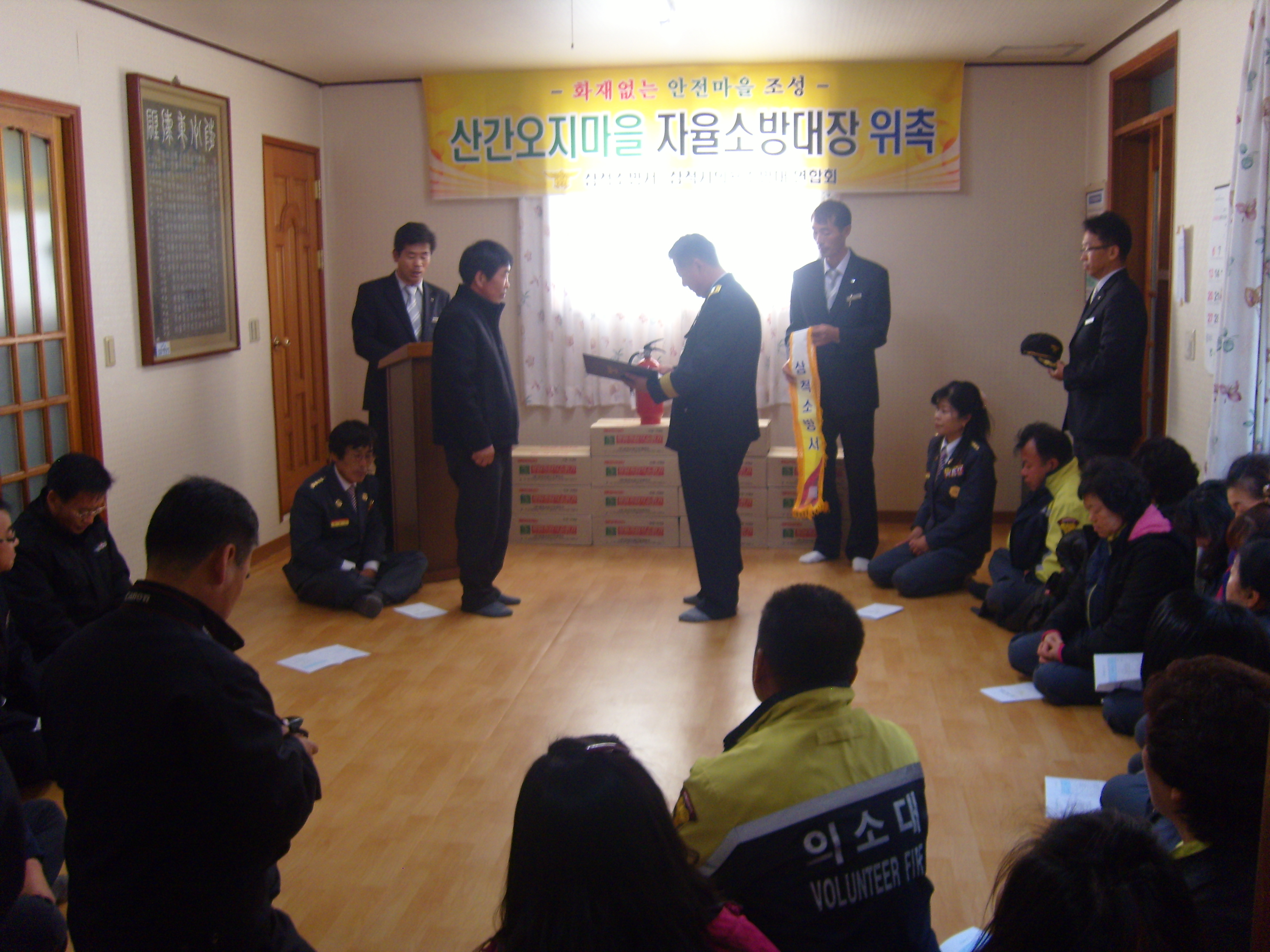 하장남.여의소대원에서는 11월 16일 하장면 대전리에 화재경보기 50개를 증정하였습니다. 남여 대원들이 집집마다 다니면서 화재경보기를 직접 달아드리고 소화기가 없는 가정에는 소화기도 배치해드렸습니다. 그리고 오후 2시에는 서정님을 비롯한 많은 관계자 여러분들이 오셔서 명예소방관 위촉식을 하였습니다.