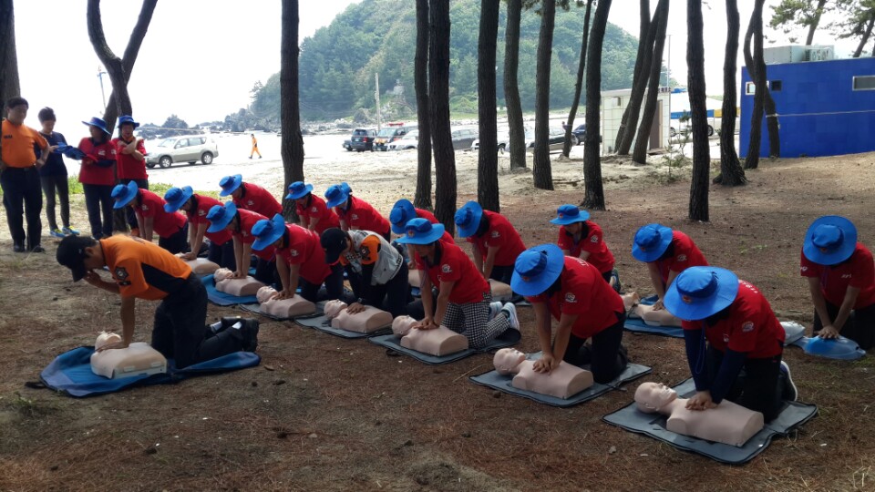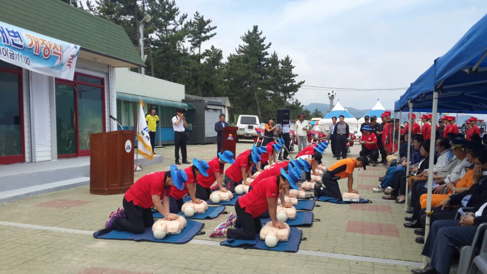 2015. 7. 10 맹방해수욕장 개장식 참가하여 119 시민수상구조대 대원들 심페소생술시범 보임(10:30~11:30)9명
