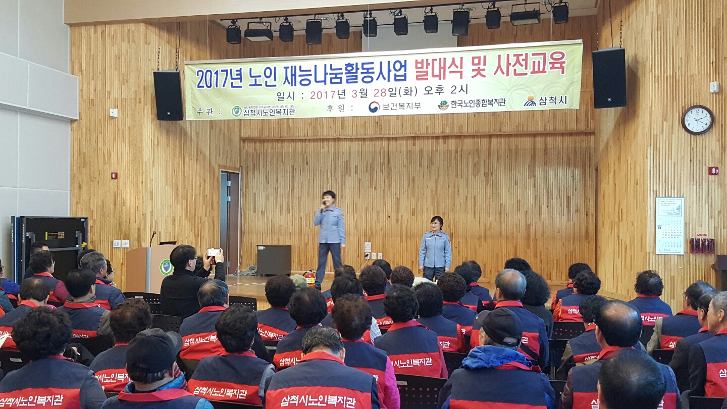 2017.3.28 14:00~16:00 노인복지관주관 2017년 노인재능나눔활동지원 발대식 및 사전교육에서 삼척여성대 수호천사분들이 심폐소생술 및 소화기사용방법교육하였습니다.