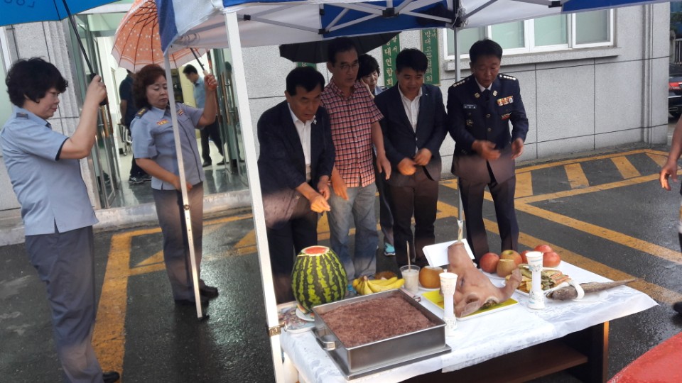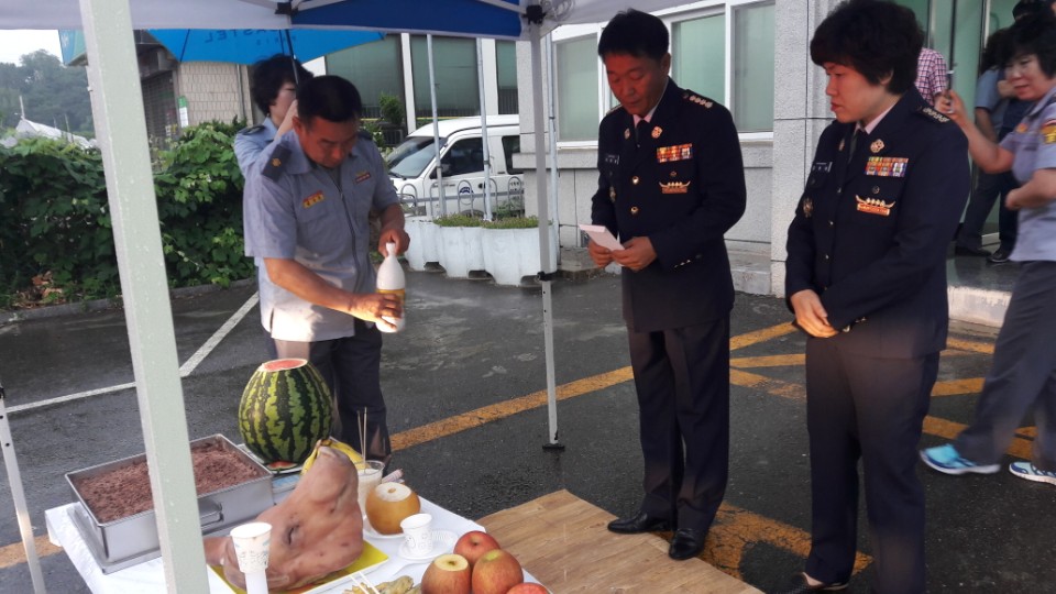 7월15일 출동차량 고사를 지냈습니다 내빈들과 의소대원들이 함께 하였습니다