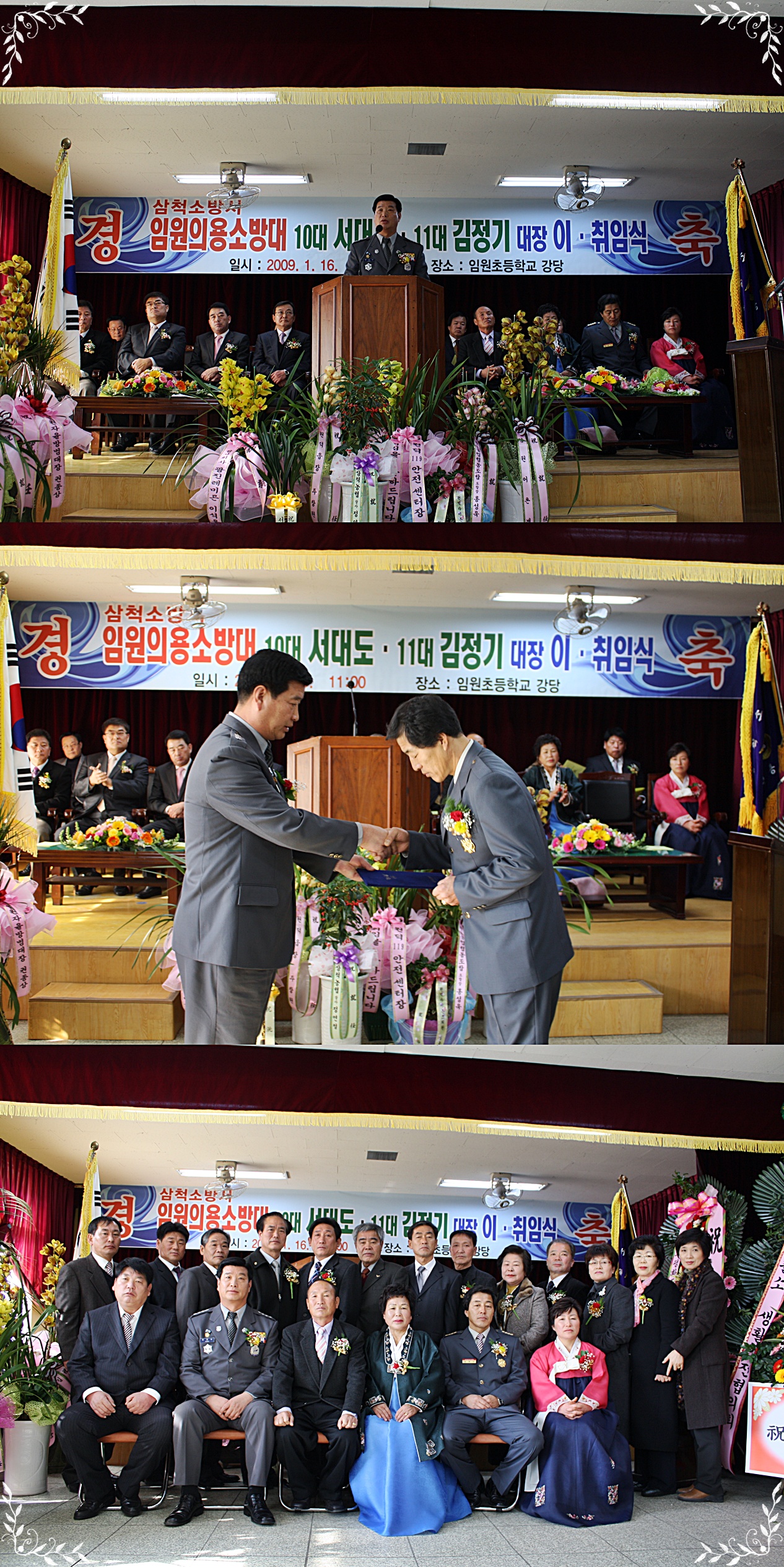 삼척소방서(서장 정경남)는 1월 16일(금) 오전 11시 임원초등학교 강당에서 임원의용소방대장 이·취임식 행사를 갖았다. 새로 취임하는 김정기 임원의용소방대장은 1985년부터의용소방대원 활동을 시작으로 지금까지 지역주민을 위한 봉사활동을 몸소 실천하여왔다. 김정기 임원의용소방대장은 "전임 서대도 의용소방대장을 대신하여 지역사회 봉사에 앞장서겠다."고 포부를 밝혔다.
