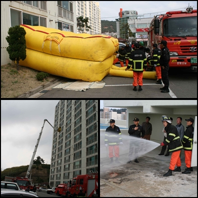 | 2009년 3월 31일 14시부터 삼척시 교동에 위치한 청솔2차아파트를 대상으로 아파트 관리소장 ,방화관리자 및 주민이 참석한 가운데 에어매트 전개 훈련, 고가사다리차 활용 인명구조 훈련 및 소화활동설비인 연결송수관설비를 활용한 화재진압훈련을 실시하고 아울러 아파트 관계자 입회하에 아파트 구조를 상세히 둘러보면서 만일의 사태에 대비하는 유비무환의 출동 및 진압태세확립에 주력하였습니다. |