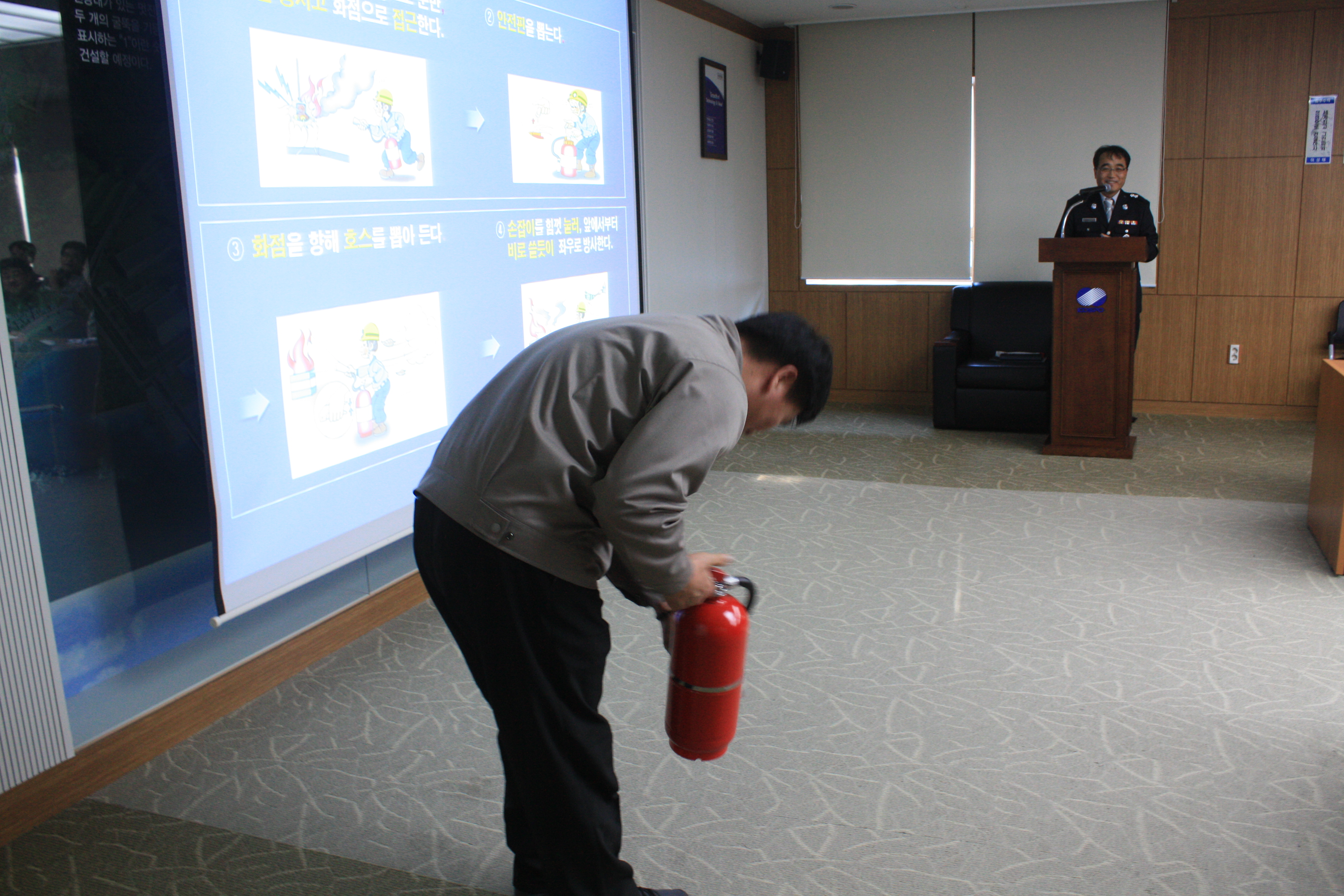 이번 교육은 매월 4일인 안전점검의 날을 맞이 하여 직원들의 소방안전의식을 향상시키고 화재시 침착한 대피요령을 확인하기 위해 실시하였으며, 소화기 사용법 및 화재발생시 패닉을 이겨내는 방법 등을 알려주어 효과적으로 화재에 대응하는 방법을 교육하였다 .