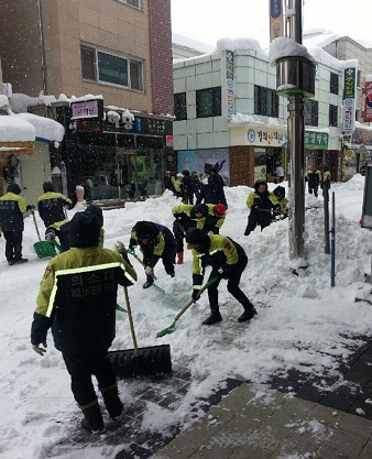 속초소방서 의용소방대원 180여명은 주요 간선도로 및 주민통행로 확보를 위한 제설작업 실시