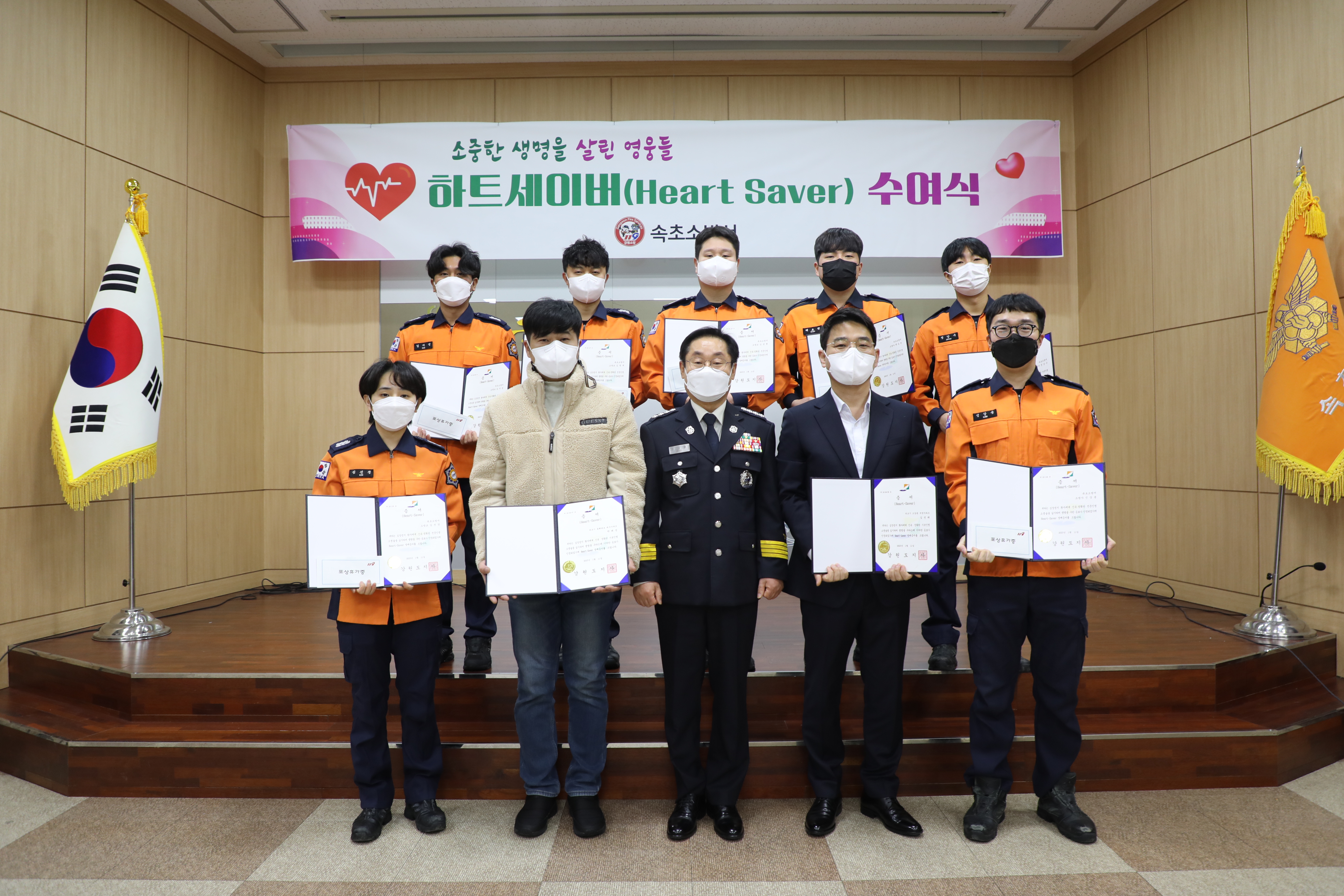 속초소방서(서장 장상훈)는 19일 신속한 응급처치로 중증환자의 소생 및 회복에 크게 기여한 구급대원 7명 및 일반인 2명에게 하트세이버 인증서를 수여했다.