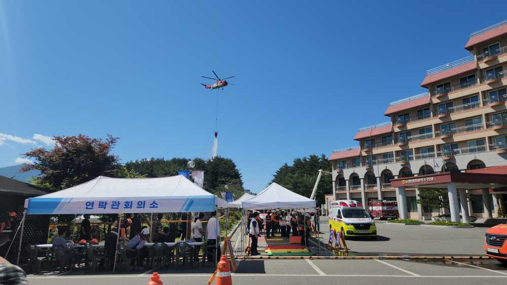 이번 훈련은 비닐하우스 화재가 강풍으로 속초시부터 고성군까지 산림 화재가 확대되어, 대응 2단계가 발령된 상황을 가정하여 진행되었으며