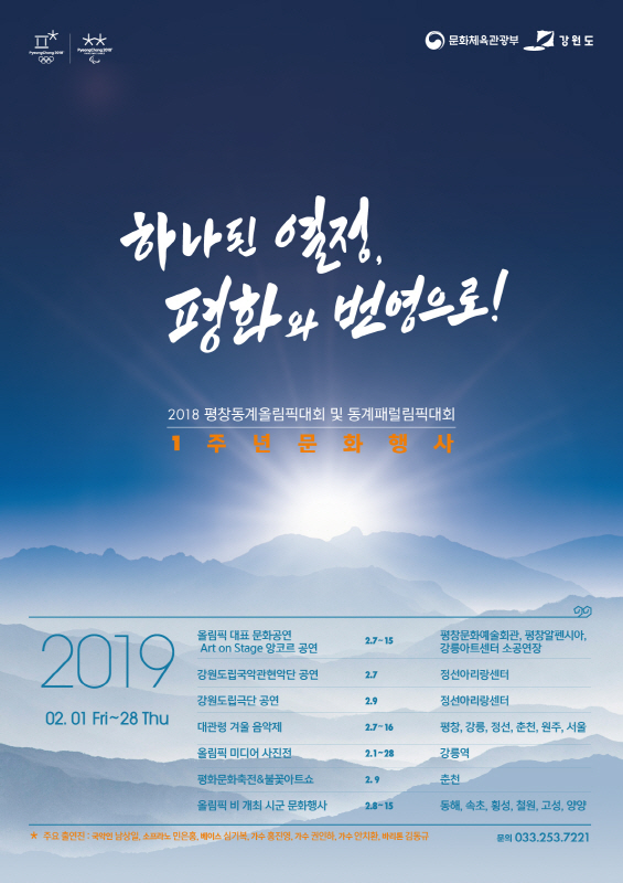 환희와 감동으로 가득했던 2018 평창동계올림픽대회 및 동계패럴림픽대회의 성공적인 개최 1주년을 기념해 문화체육관광부와 강원도에서 다채로운 문화행사를 선보입니다.