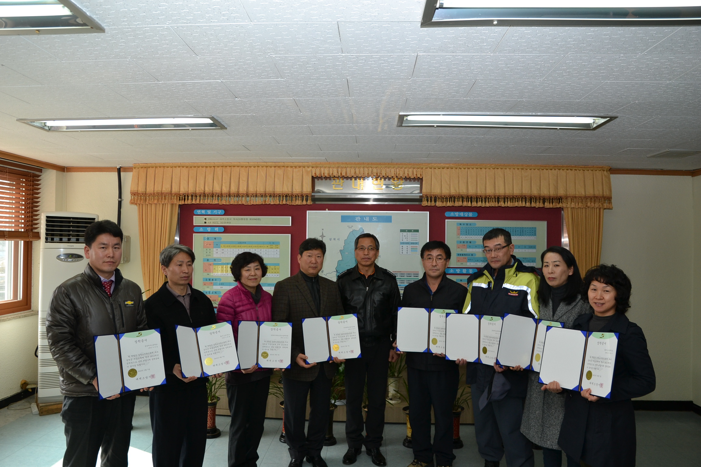 태백소방서(서장 김진봉)는 3. 7(목) 오후 3시 서장실에서 지역인재 육성을 위해 모범 의용소방대원 자녀 9명에게 장학금과 장학증서를 수여 하였읍니다.