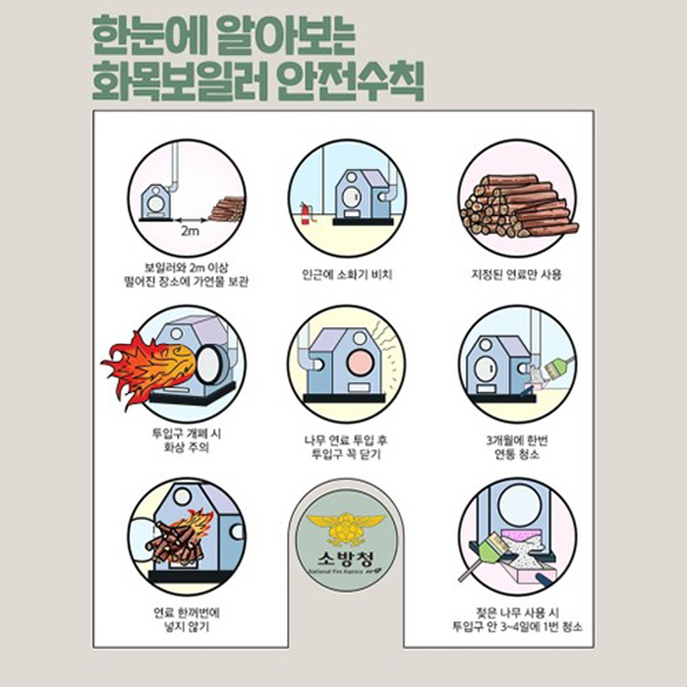 ◯ 화목보일러 안전수칙에는 ▲보일러와 2m 떨어진 곳에 가연물 보관 ▲보일러 인근에 소화기 비치 ▲나무 연료 투입구를 닫아 불씨 날림 방지 ▲연통에 찌꺼기가 쌓이지 않도록 주기적 청소 등이 있다.