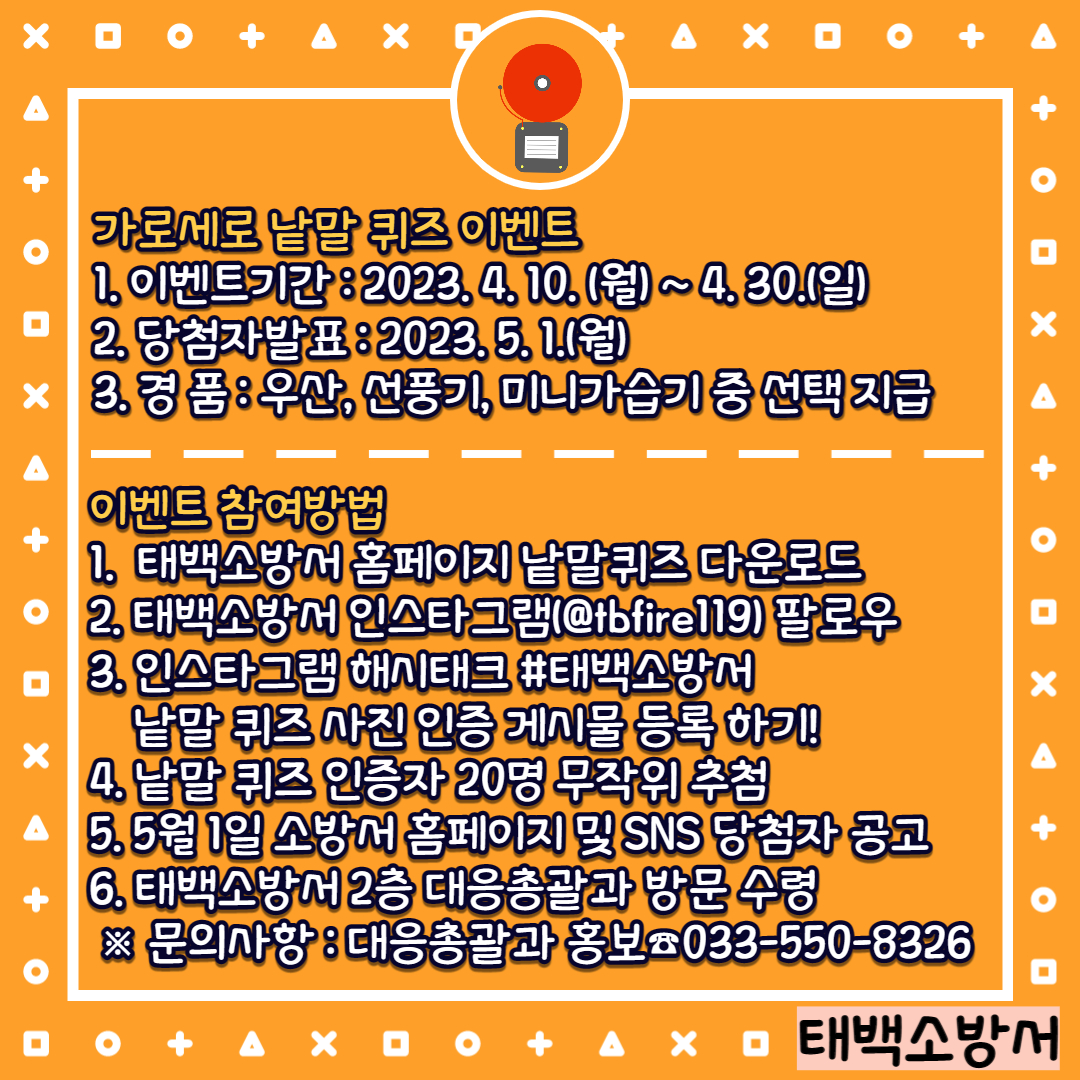 참여방법은 소방서 홈페이지에 게시된 낱말퀴즈를 풀은 후 태백소방서 공식 인스타그램 팔로우 및 게시물 인증을 하면 된다.