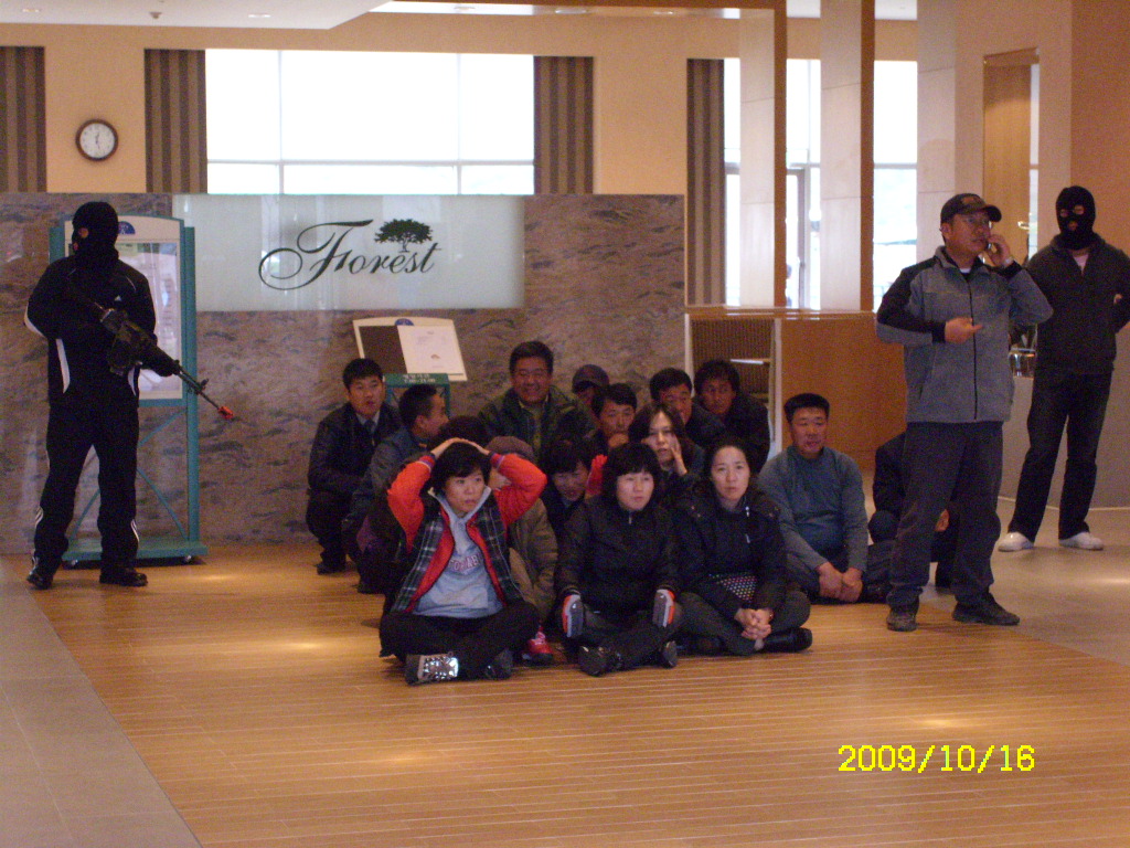 복면한 테러범들이 우리에게 공포탄을 쏘며 위협을 할 때, 훈련임에도 불구하고 사실 우리들은 굉장히 무서웠습니다.