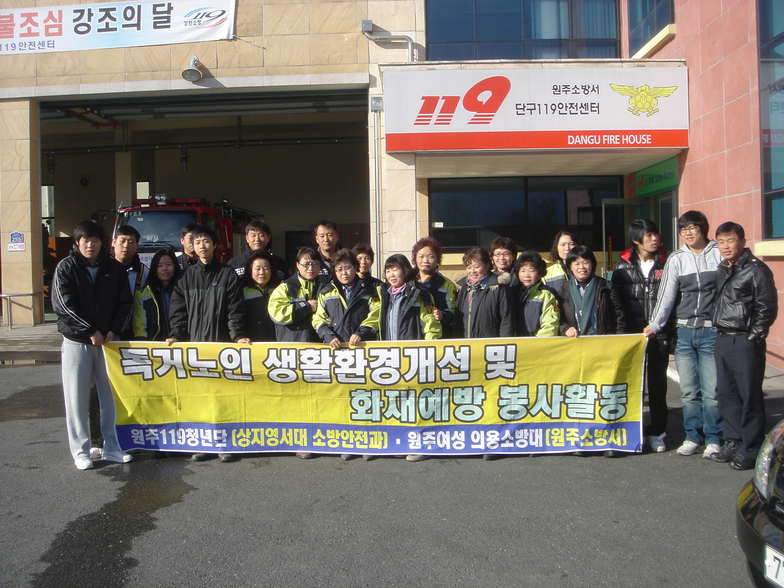 판부여성의용소방대(대장 노순일)에서는 11. 26(금)일 상지영서대 119청년단과 함께 봉사활동들 실시하였습니다. 이날 판부면 일대에 사시는 독거노인분들을 ?아뵙고 집 내, 외부를 개끗이 청소해드리고, 화재시 안전하게 대피하시라고 단독형 감지기를 설치해드리로 왔습니다.