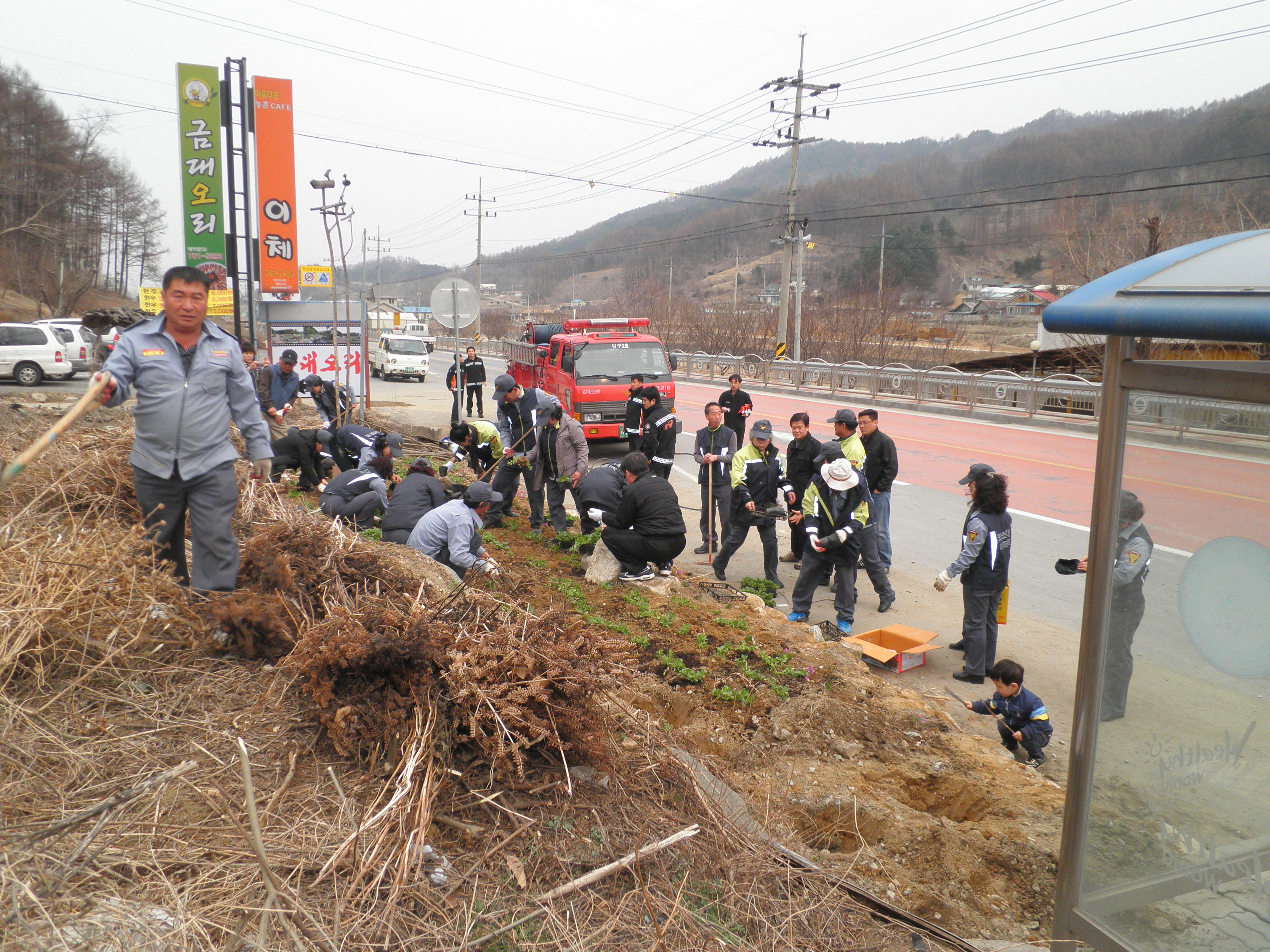 캠페인을 마친후 국도변 금대초등학교 앞 정류장 옆 작은 화단 1곳 과, 금대3리 국도변 옆 작은 화단 2곳에 꽃을 식재 하였습니다.