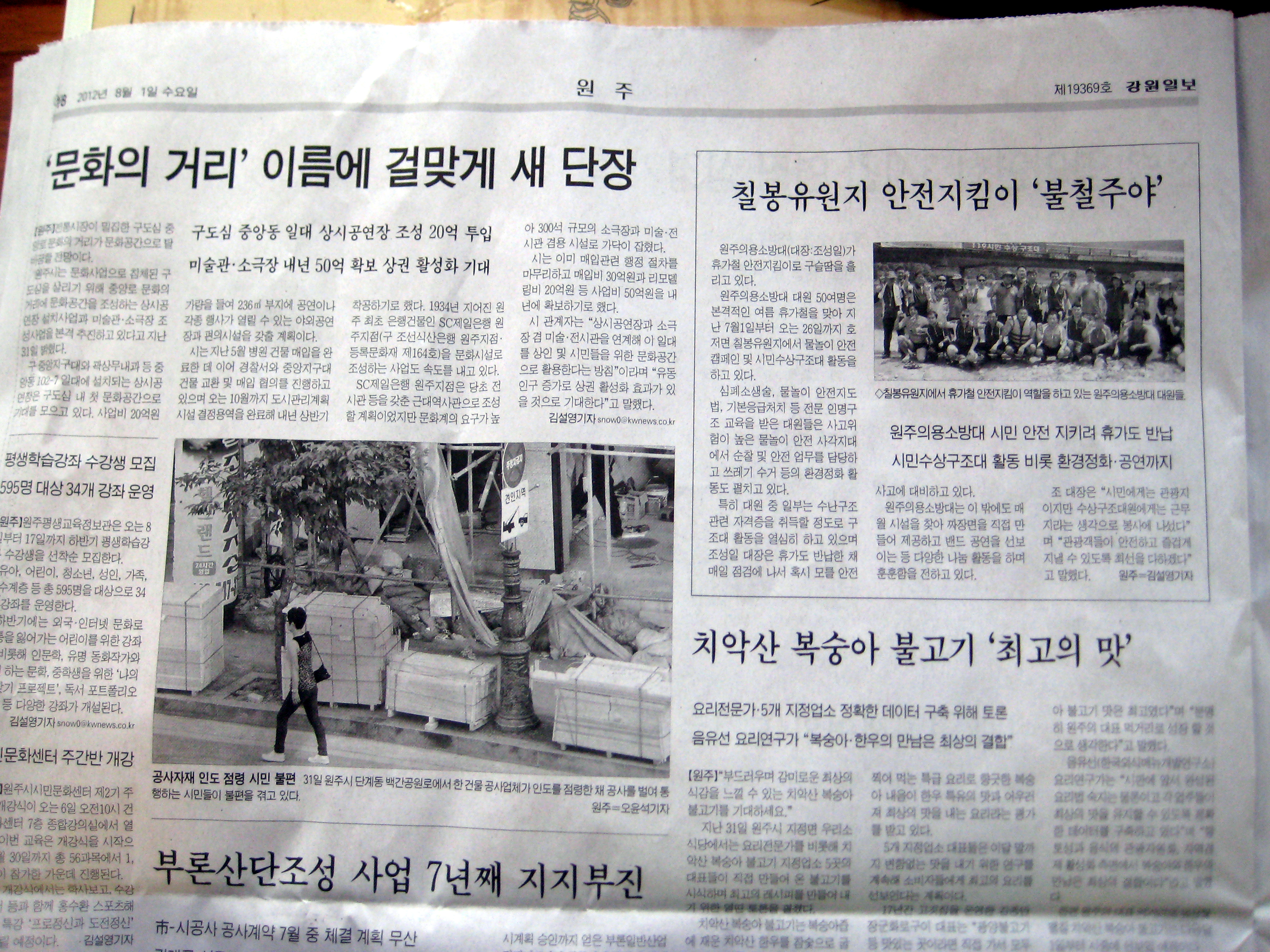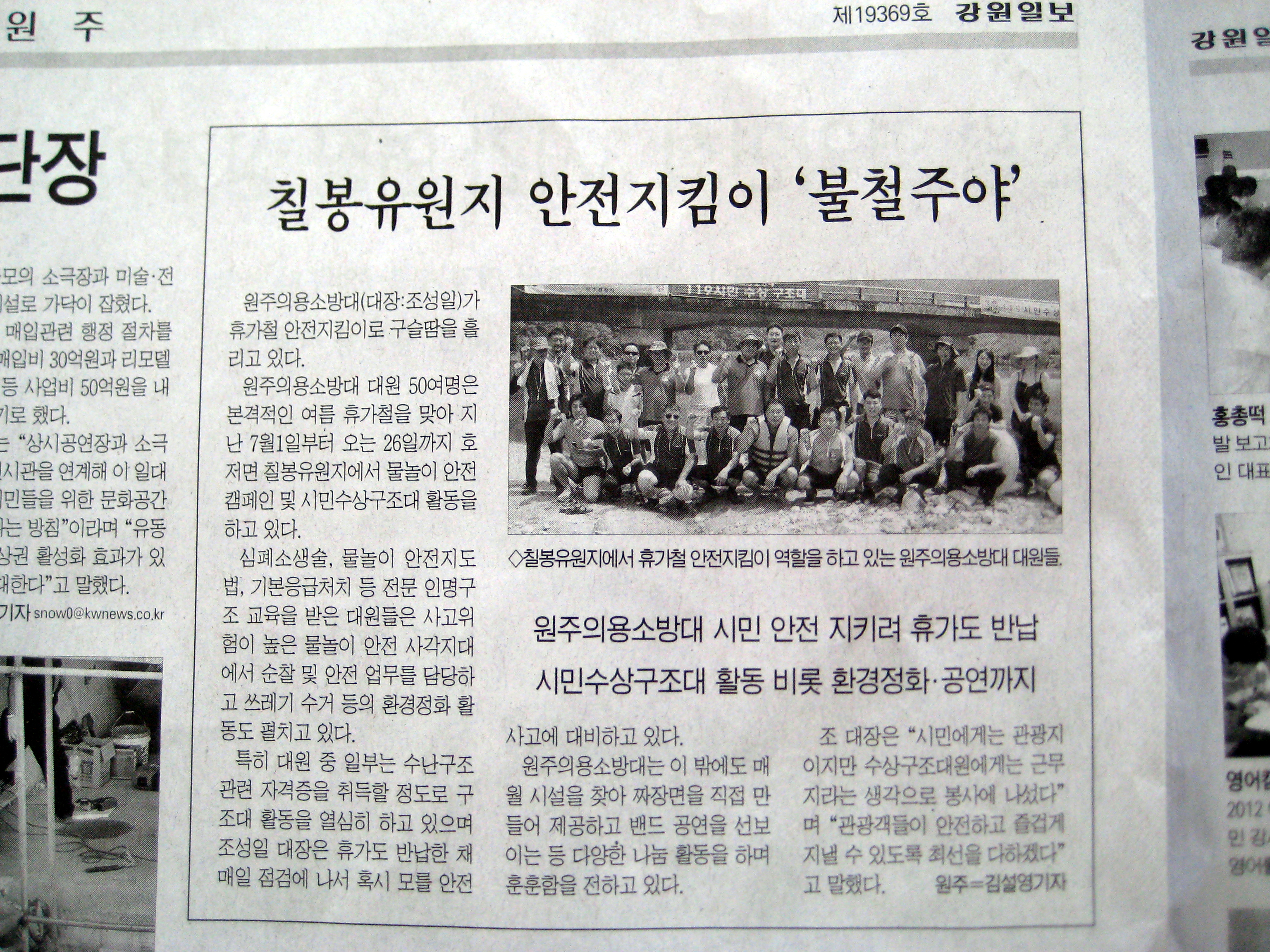 원주의용소방대(대장 조성일) 대원 칠봉유원지 수상안전요원 봉사활동강원일보 8월1일자에 신문에 실렸습니다