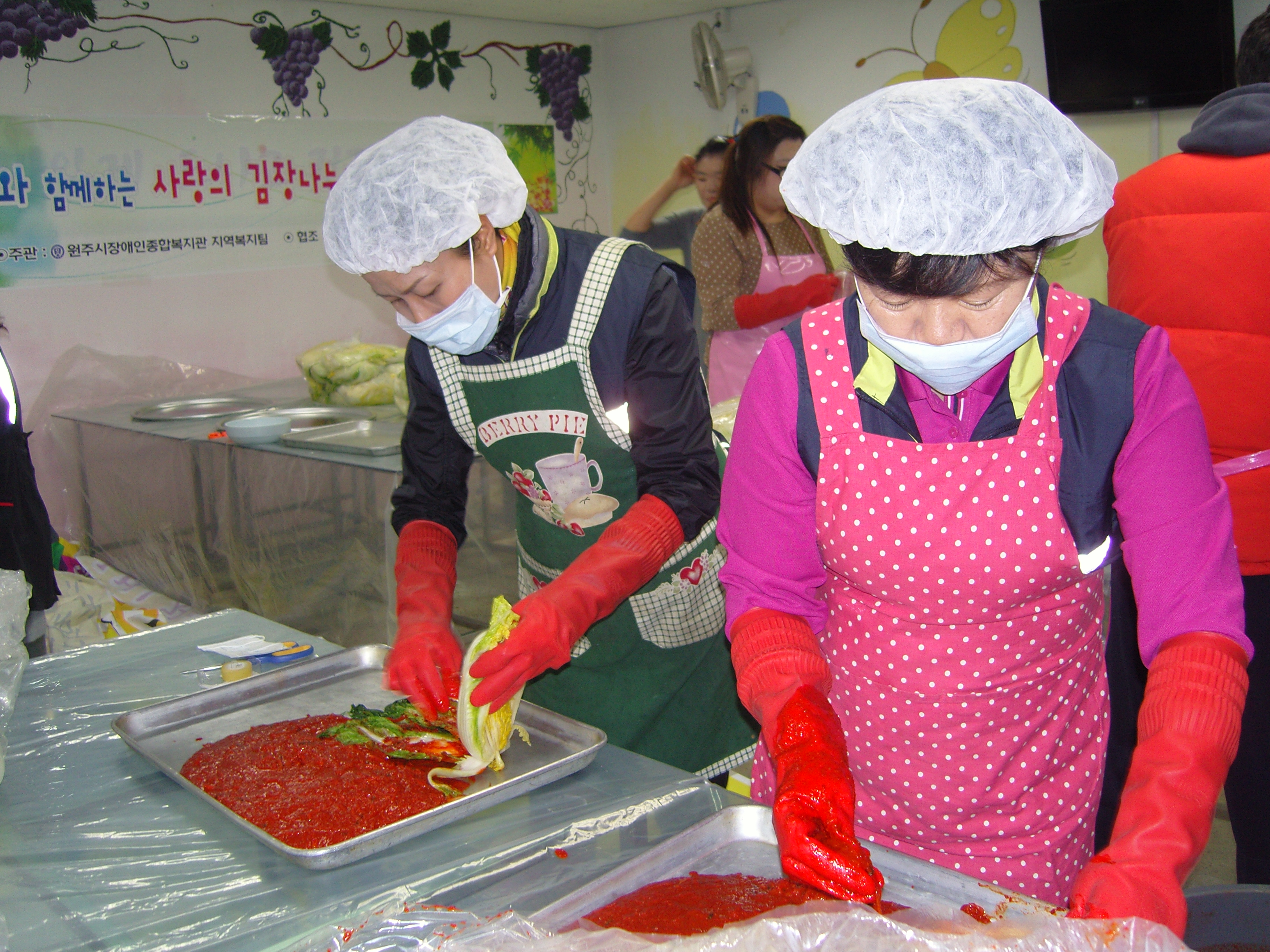 작년에 이어 두 번째로 실시한 장애인복지관 김장담그기행사는 한국전력에서 제공한 배추를 가지고 흥업여성대의 맛깔스런 엄마표 손맛으로 정성을 다해 만들었답니다. 한국전력 아저씨들은 우리 대원들의 능숙한 손놀림 때문에 포장이 많이 밀려 연신 "천천히, 천천히 해주세요~!!"를 외쳤답니다. 덕분에 산더미처럼 쌓여있던 배추 1,700포기는 대원들의 웃음소리와 함께 빠르게 빨간옷으로 갈아입고 새집(Box)으로 들어갔고요. ^^