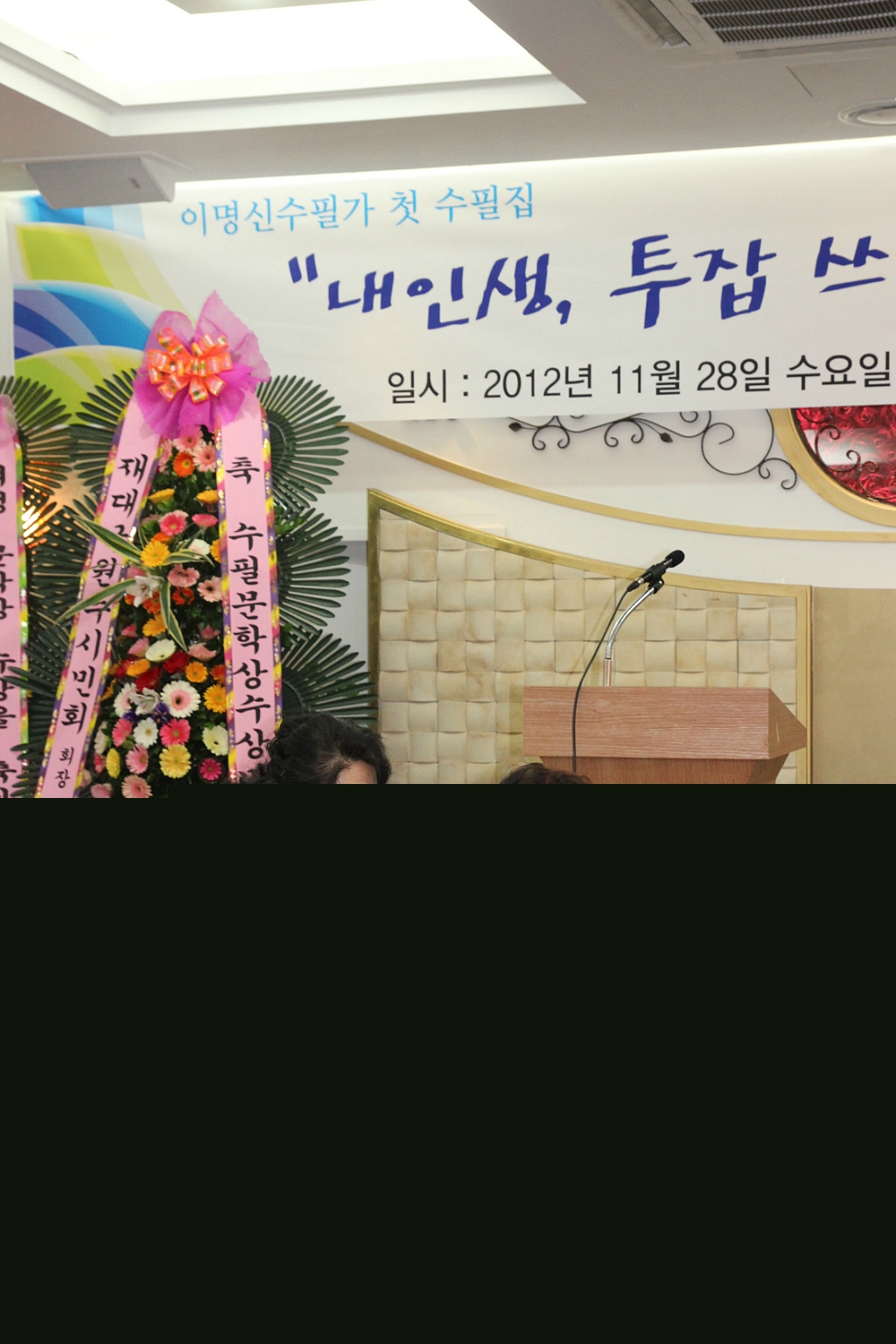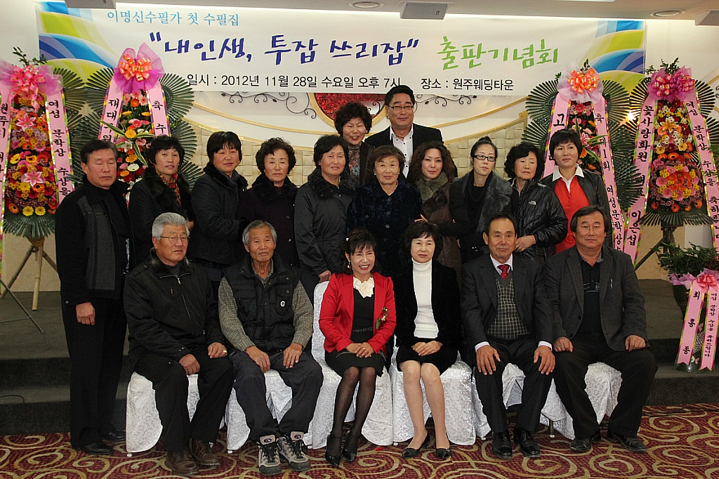 호저여성의소대에서는 지난 11월 28일 오후 6시, 원주웨딩타운에서 즐거운 행사를 가졌답니다. 홍보부장을 맡고 있는 이명신 대원의 제 1회 원주문학상 수상과 수필집의 풀판 기념회를 축하했는데요. 많은 대원들과 또 다른 여러 단체 들이 마을 주민들과 분위기 있는 문학 행사를 가졌답니다.