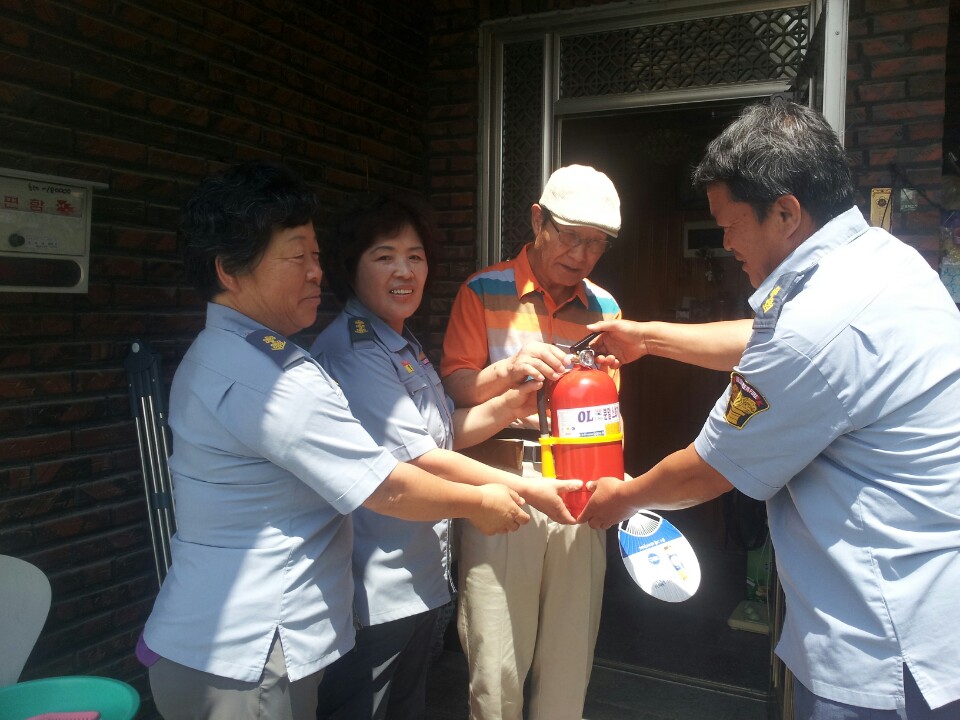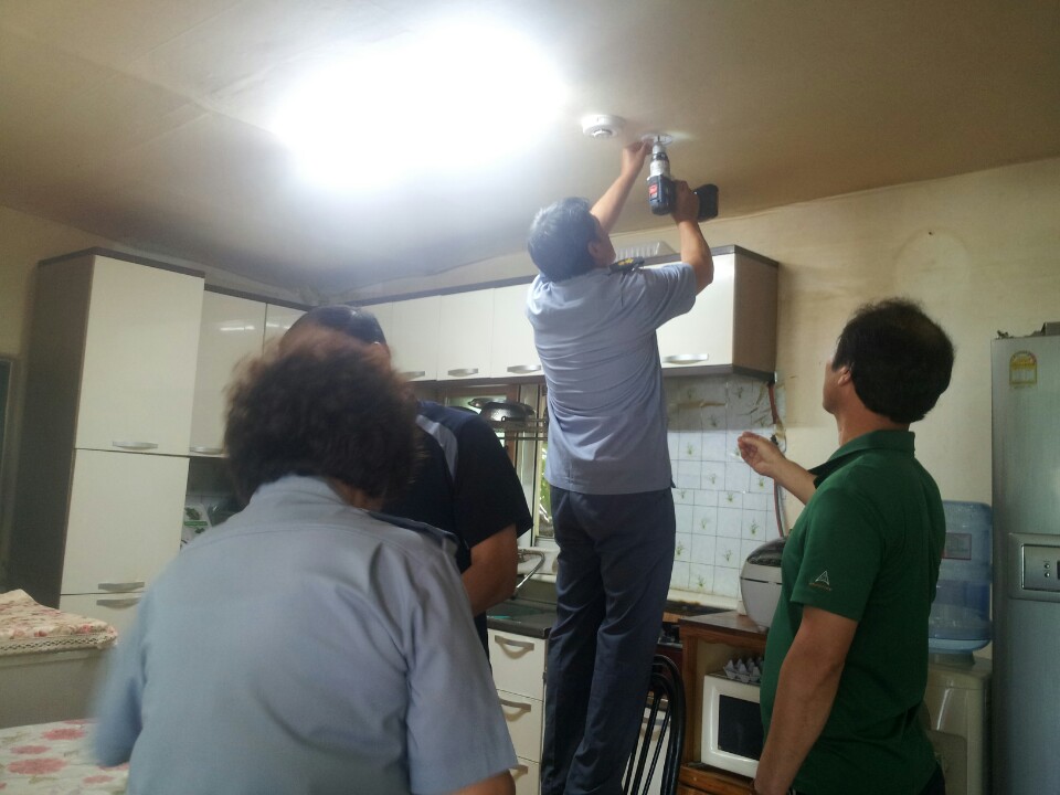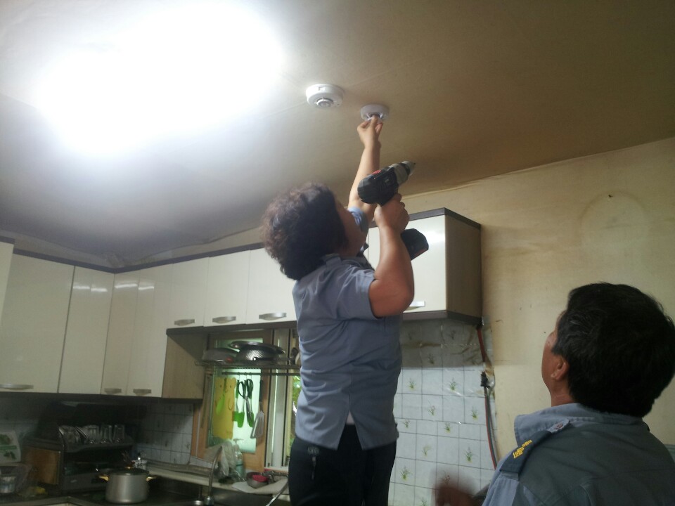 연기가 나면 소리로 작동하는 센서를 달아드리고 소화기도 비치해 드렸습니다