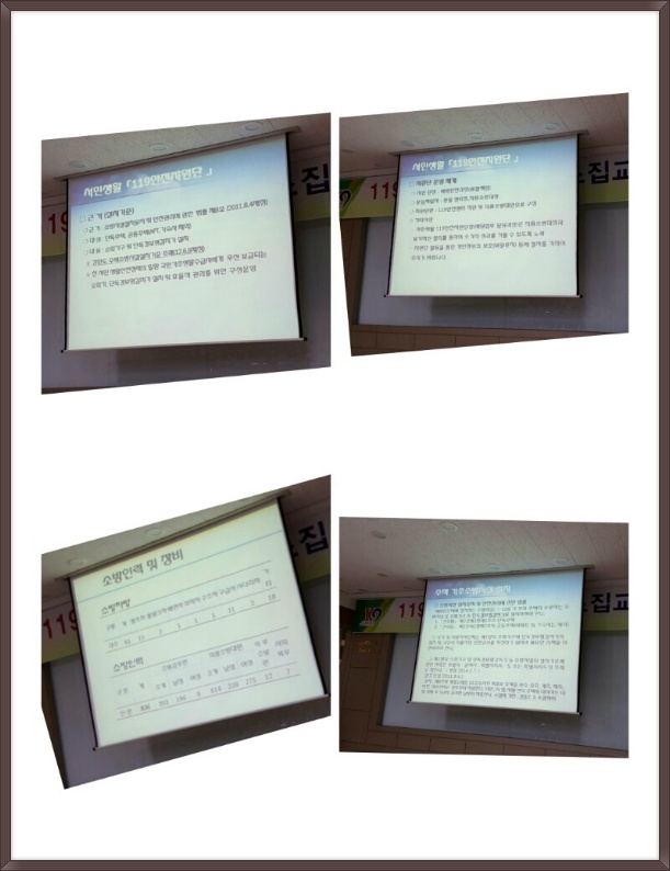 2015년11월23일 월요일 1시30분 ~ 3시30분 명륜센터에서 119생활 안전지원단 소집교육에 김영연대장님 이미자총무부장님 권옥희부장님 천영덕부장님 참석하여 교육을 받으셨습니다...