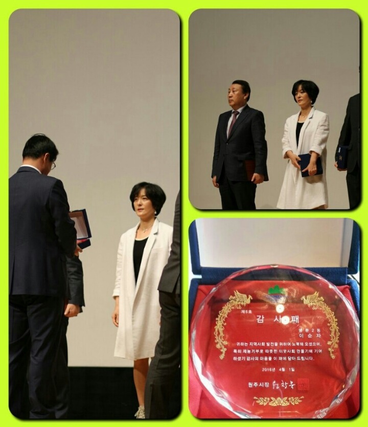 내용 : 원주시에서 주최하는 "재능기부 봉사활동 감사패"를 이순자대원님이 받으셨어요