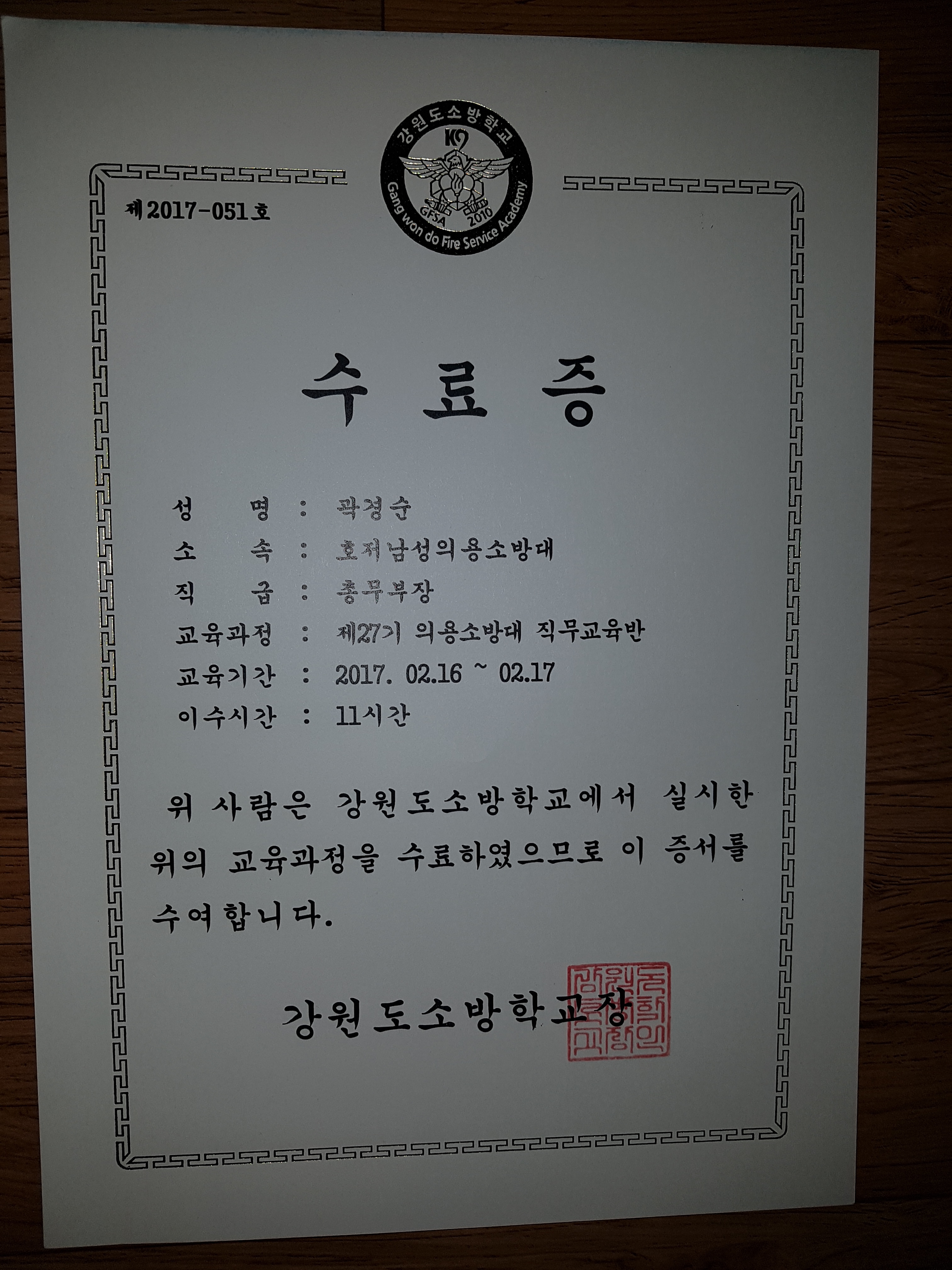 제27기 의용소방대 교육직무반 교육 수료