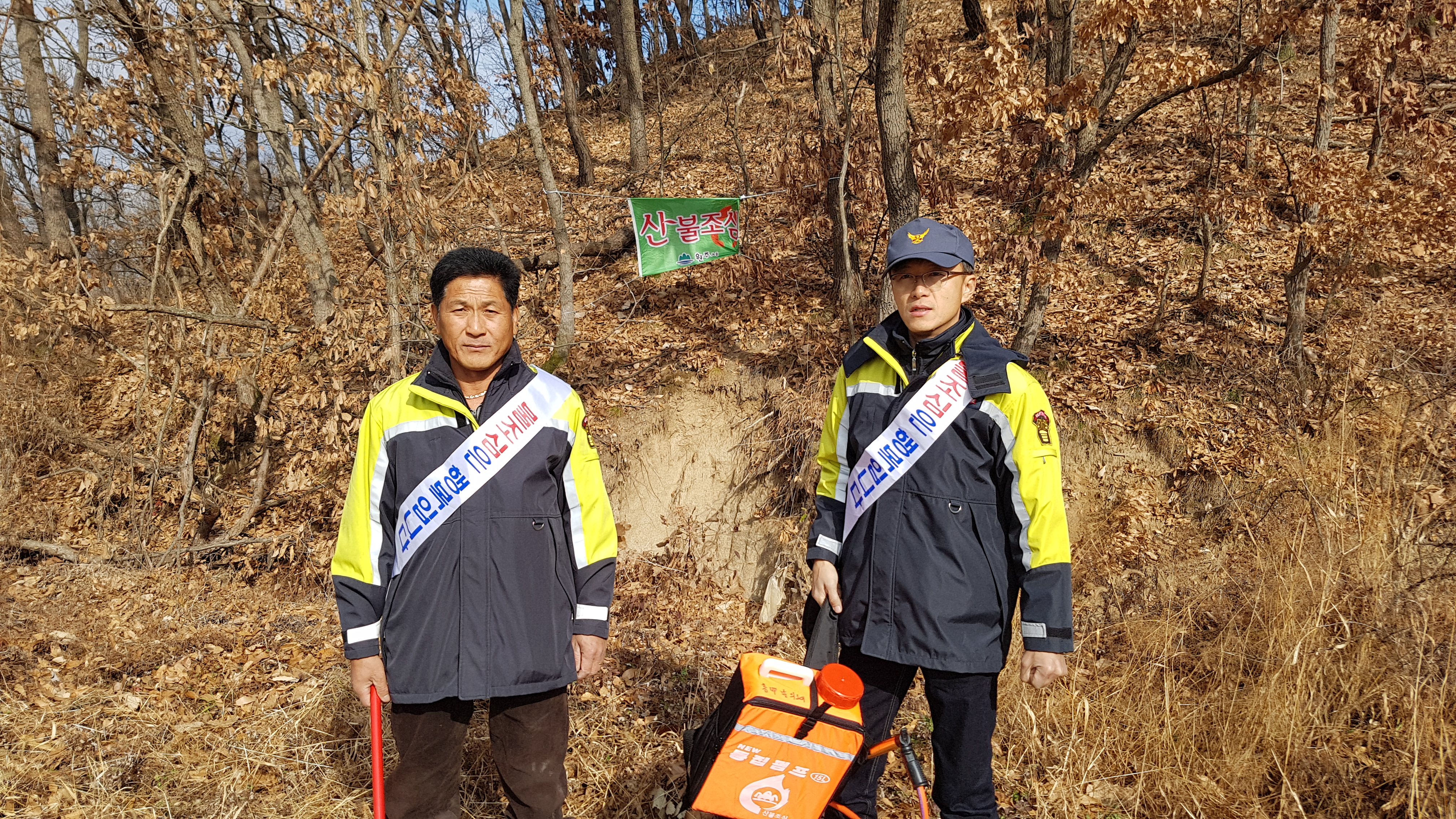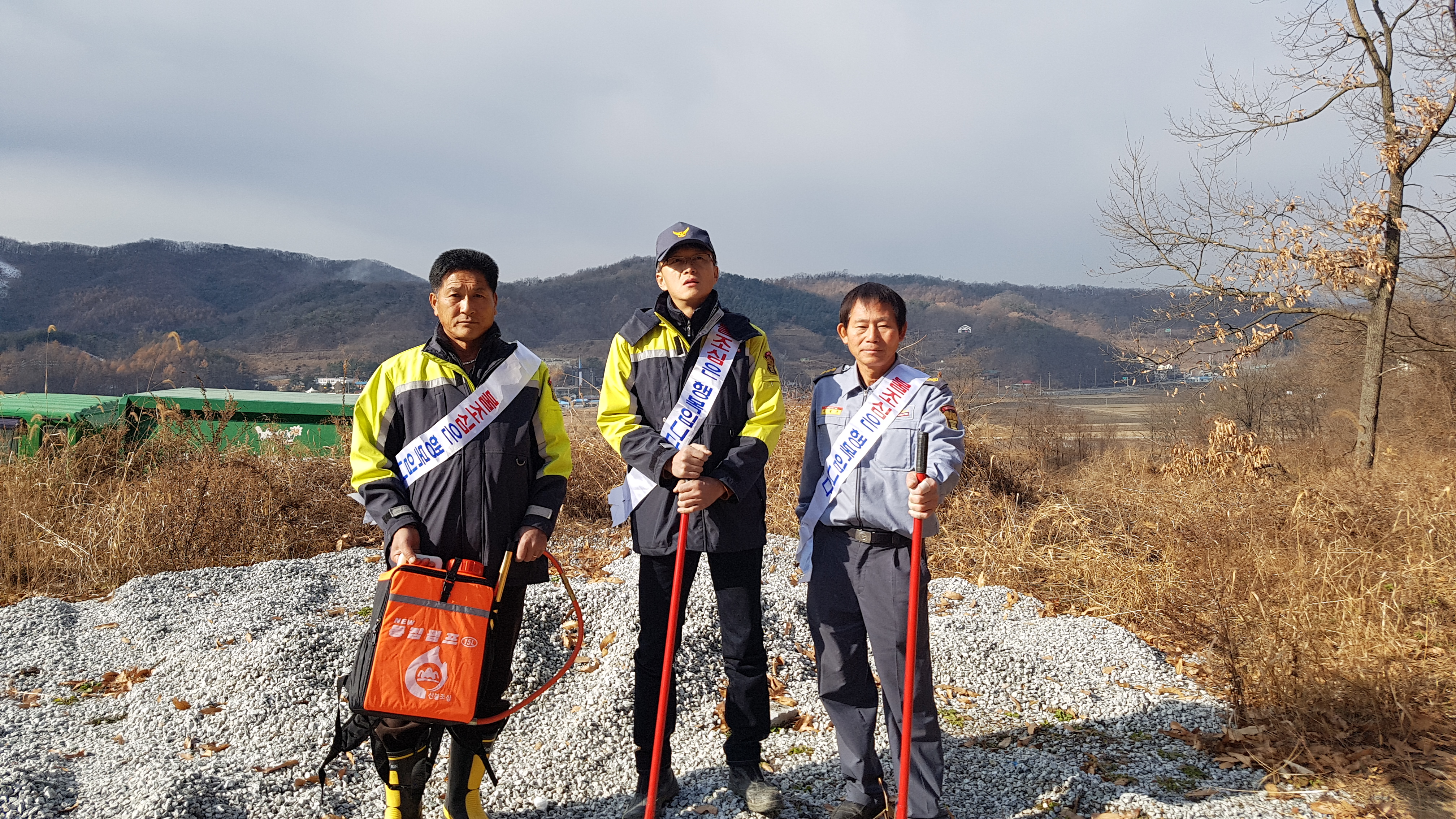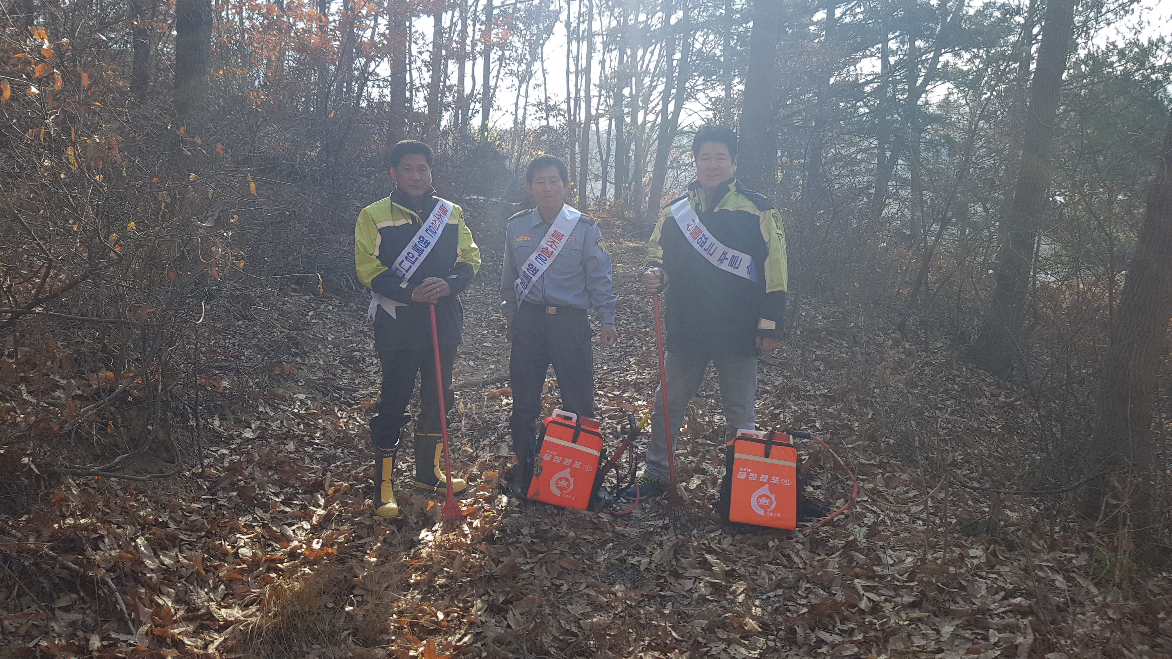 장비 : 산불예방 홍보 어깨띠, 갈퀴, 등짐펌프.산불예방 현수막