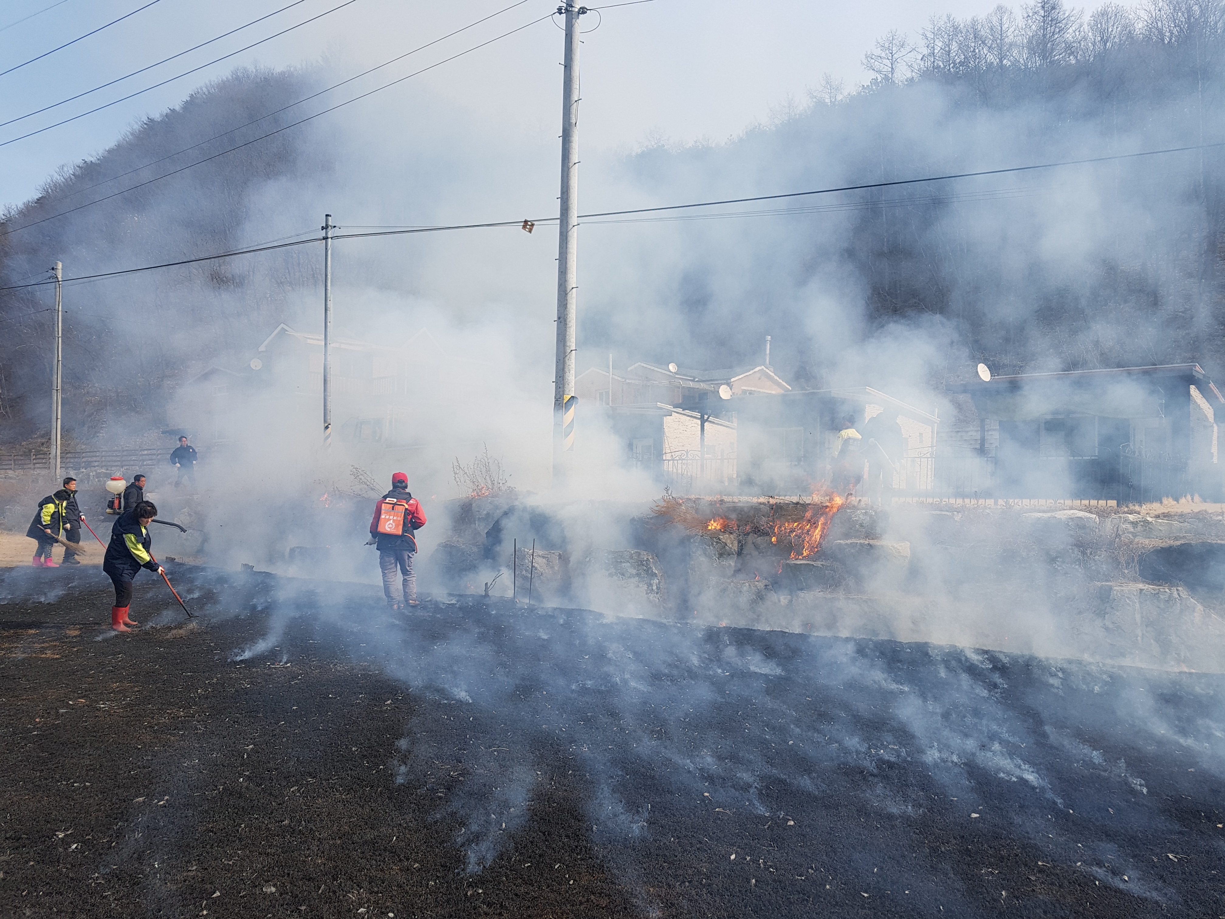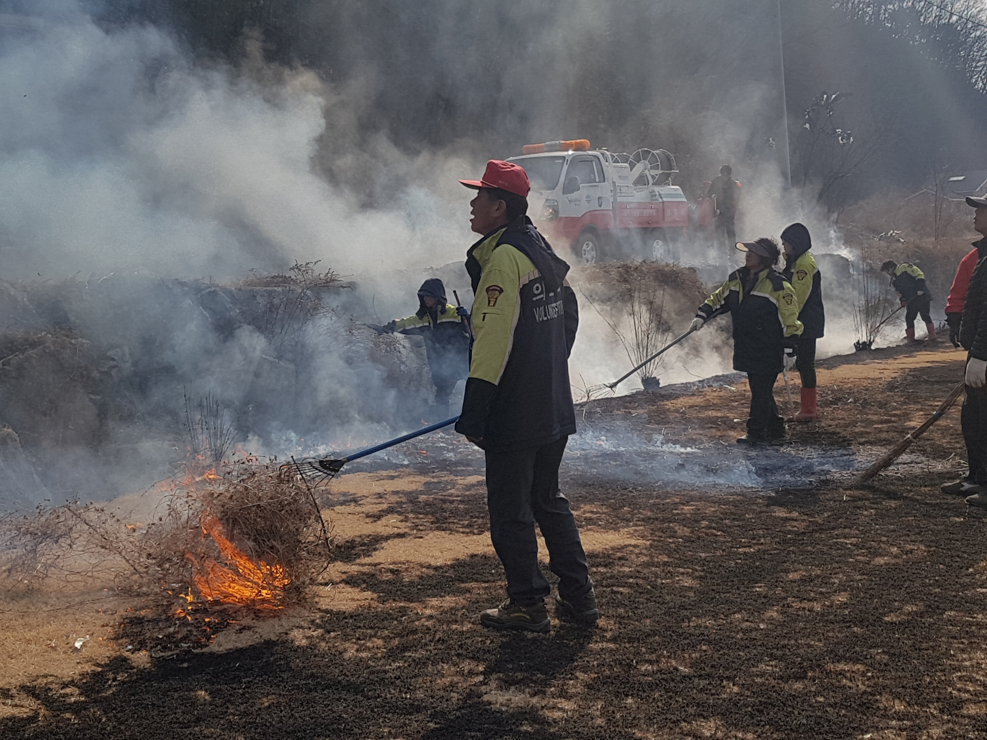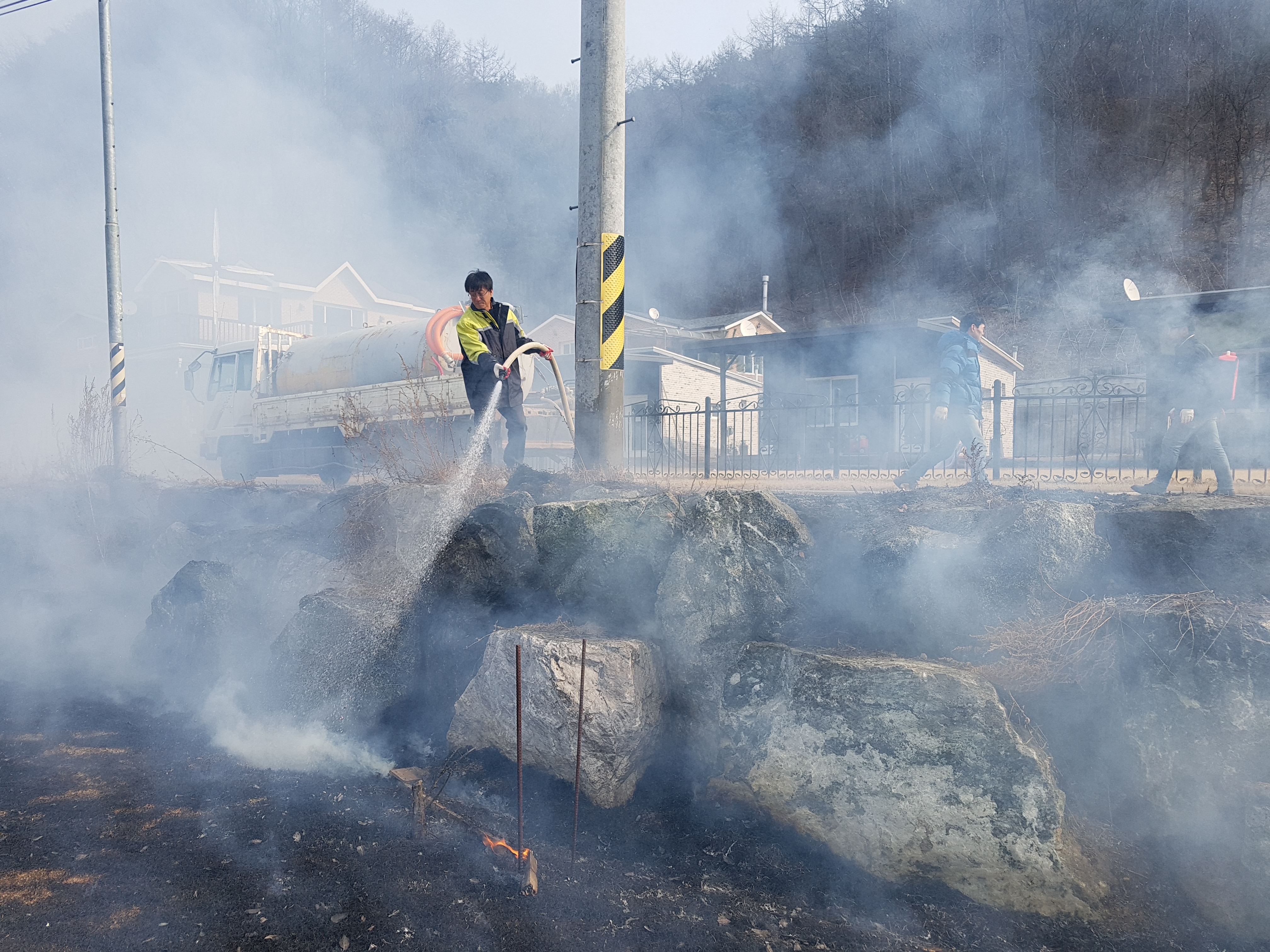 간이 소화기 등짐펌프 살수차등을 준비하여 소각을 실시하였습니다.