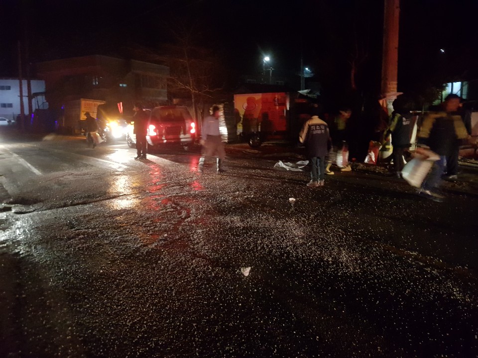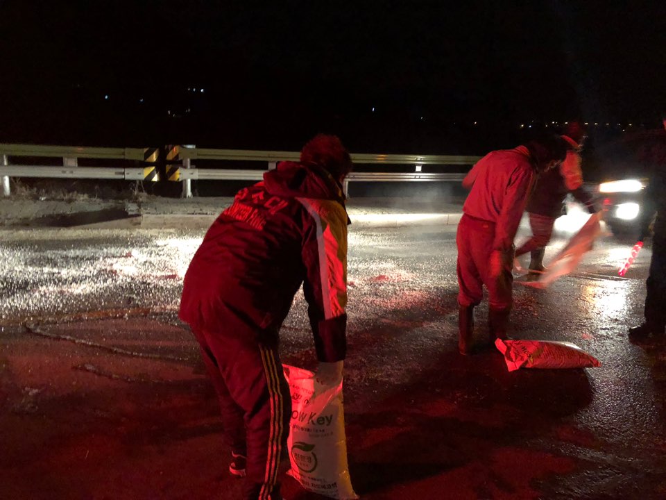 결빙된 도로 염화칼슘 제설작업.........................등