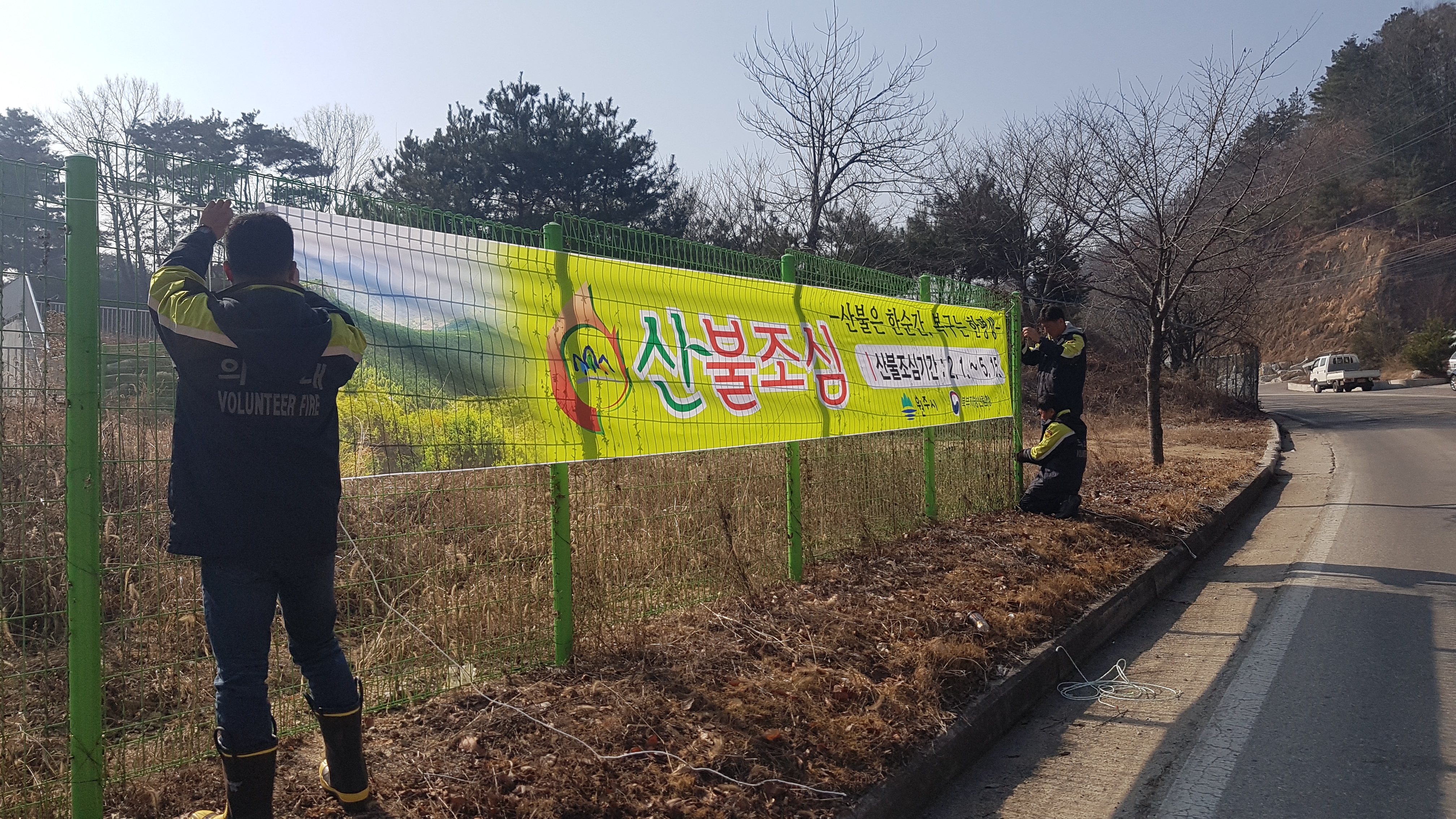 흥업남성의용소방대" 대안3리 농작물 소각활동 및 현수막 설치"