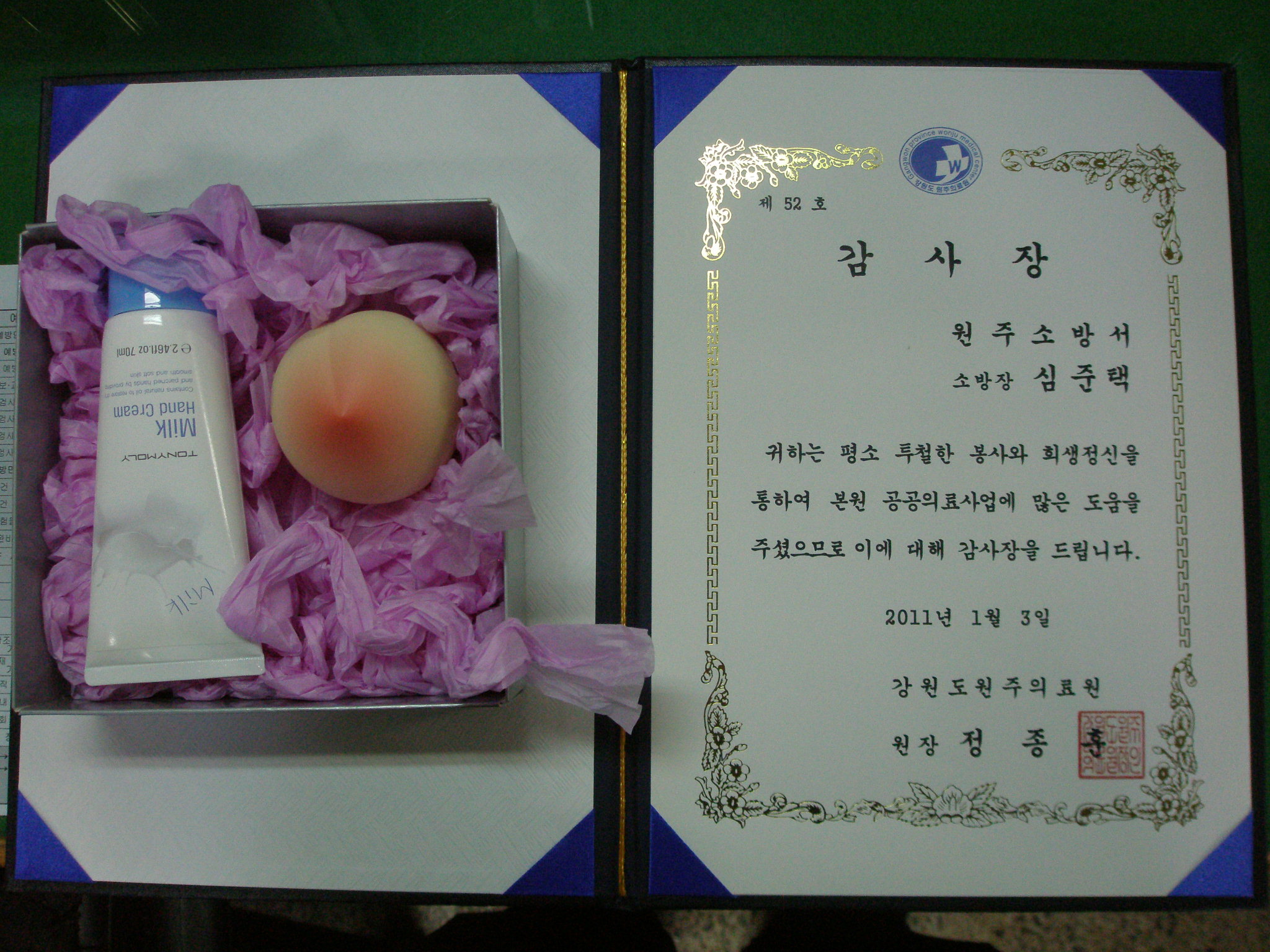 원주소방서(서장 박창진) 명륜 119안전센터는 금일 원주의료원으로부터 구급대원분들께 감사의 의미가 담긴 표창장과 부상을 전달 받았습니다. 불철주야 국민의 생명과 안전을 지키는 구급대원들의 고마움을 다시 한번 느낄 수 있는 좋은 계기가 되었습니다. 더불어 앞으로는 더이상 구급대원에 대한 폭행 사건이 없기를 간절히 소망합니다. 구급대원 여러분 정말 고맙습니다.
