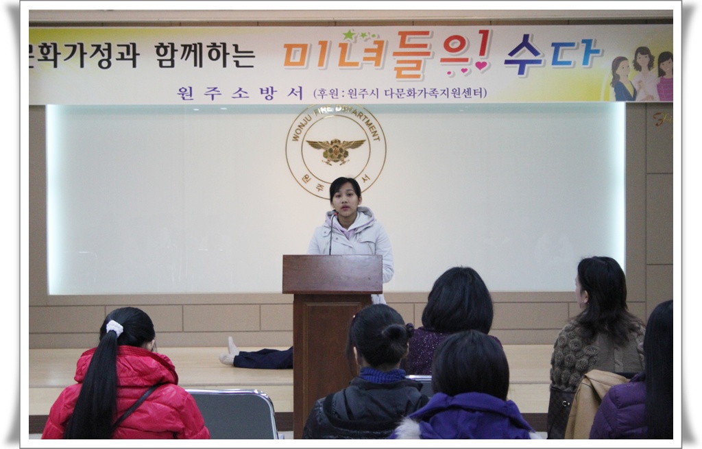 원주소방서(서장 김시균)는 25일(금) 관내 거주하는 다문화가정 주부 70여명을 초청해 "미녀들의 수다" 행사를 개최하였습니다.