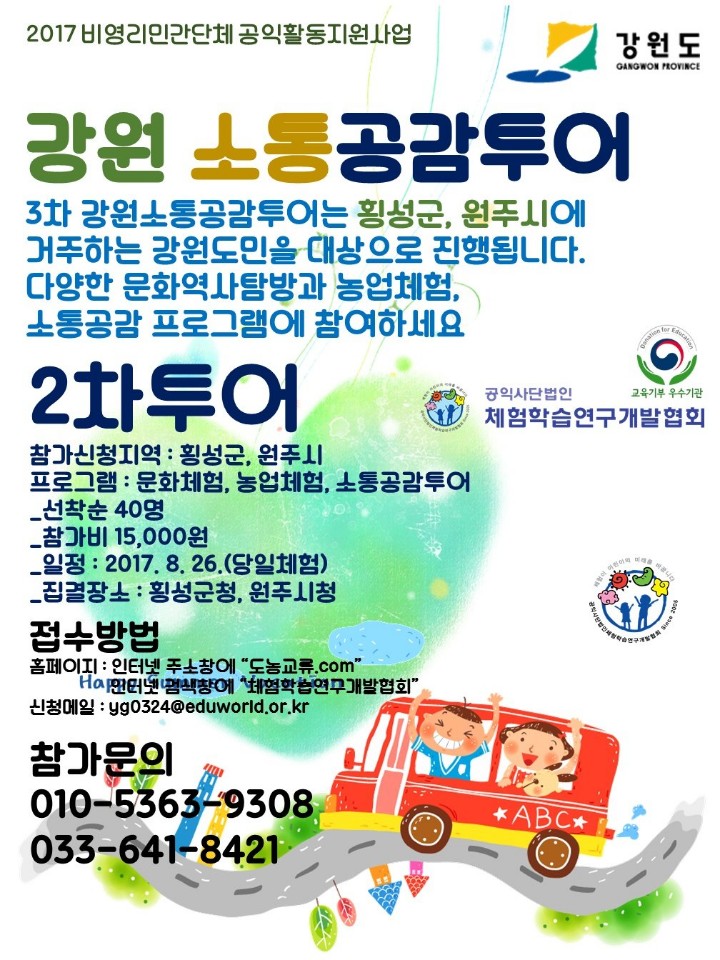 공익사단법인 체험학습연구개발협회는 우리 사회의 소외계층과 농어촌의 소외지역에 따뜻한 손길이 되고, 청소년들의 꿈과 미래를 한결같은 마음으로 지원하고, 교육기부 및 농어촌 재능기부에도 최선을 다하고자 노력하고 있으며 교육부 교육기부 우수기관으로 지정(제2016-025호)된 비영리민간단체입니다. 본 단체에서는 2017 강원도 비영리민간단체 공익활동 지원사업으로 선정된 ‘2017 강원 소통공감투어’를 아래와 같이 진행하고자 하오니 강원도민 여러분의 많은 참가 바랍니다.
