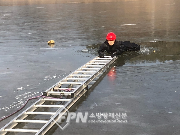 소방서는 이론교육을 선행한 후 ▲빙상구조장비 활용 통한 인명구조 ▲해빙기 얼음 특성 이용 접근법 ▲얼음 밑 구조 체계적 훈련 등 실습을 진행했다.
